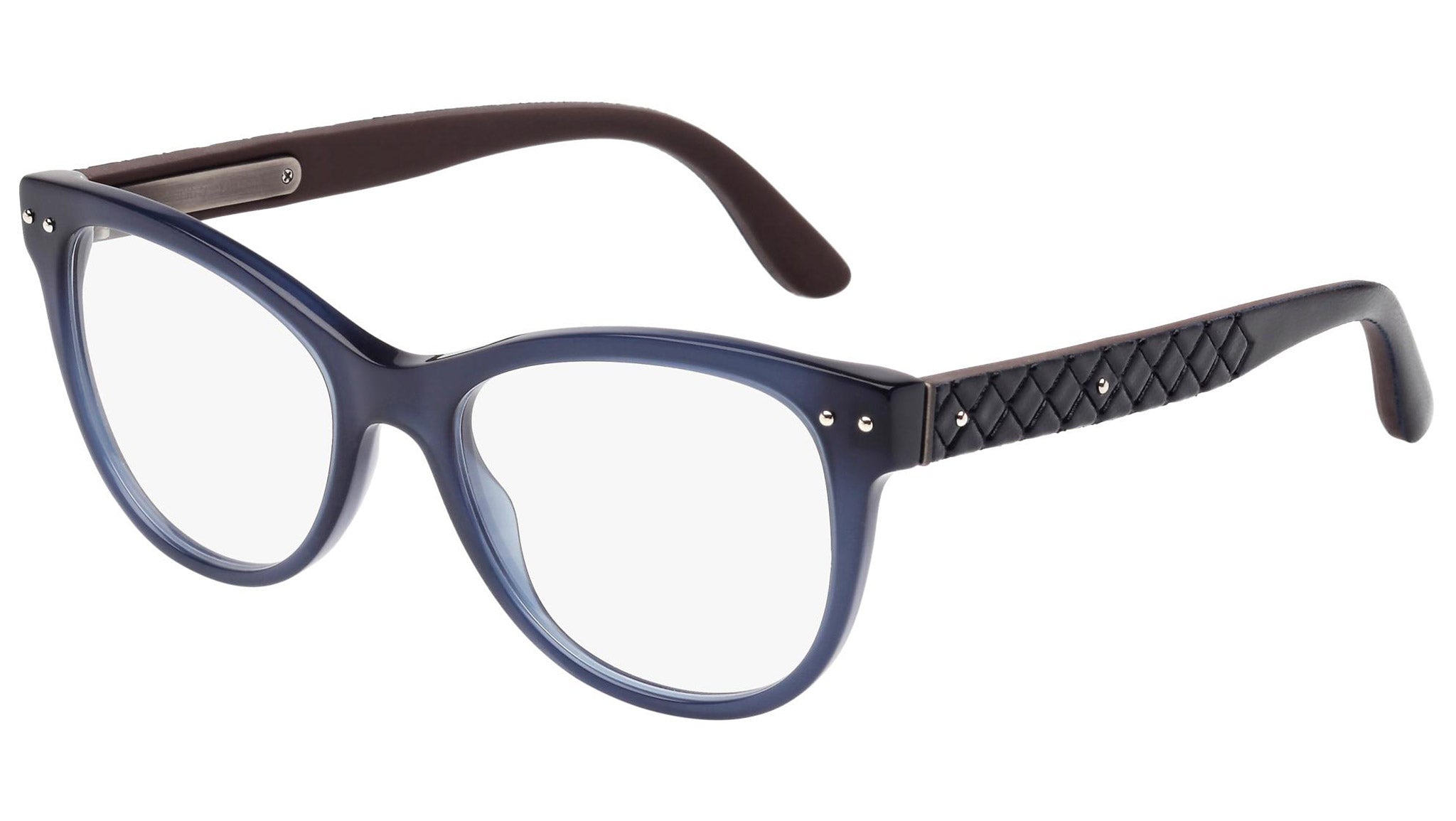 Occhiali da vista Bottega Veneta modello 0009O 004 featuring shiny blue front frame and blue temple.