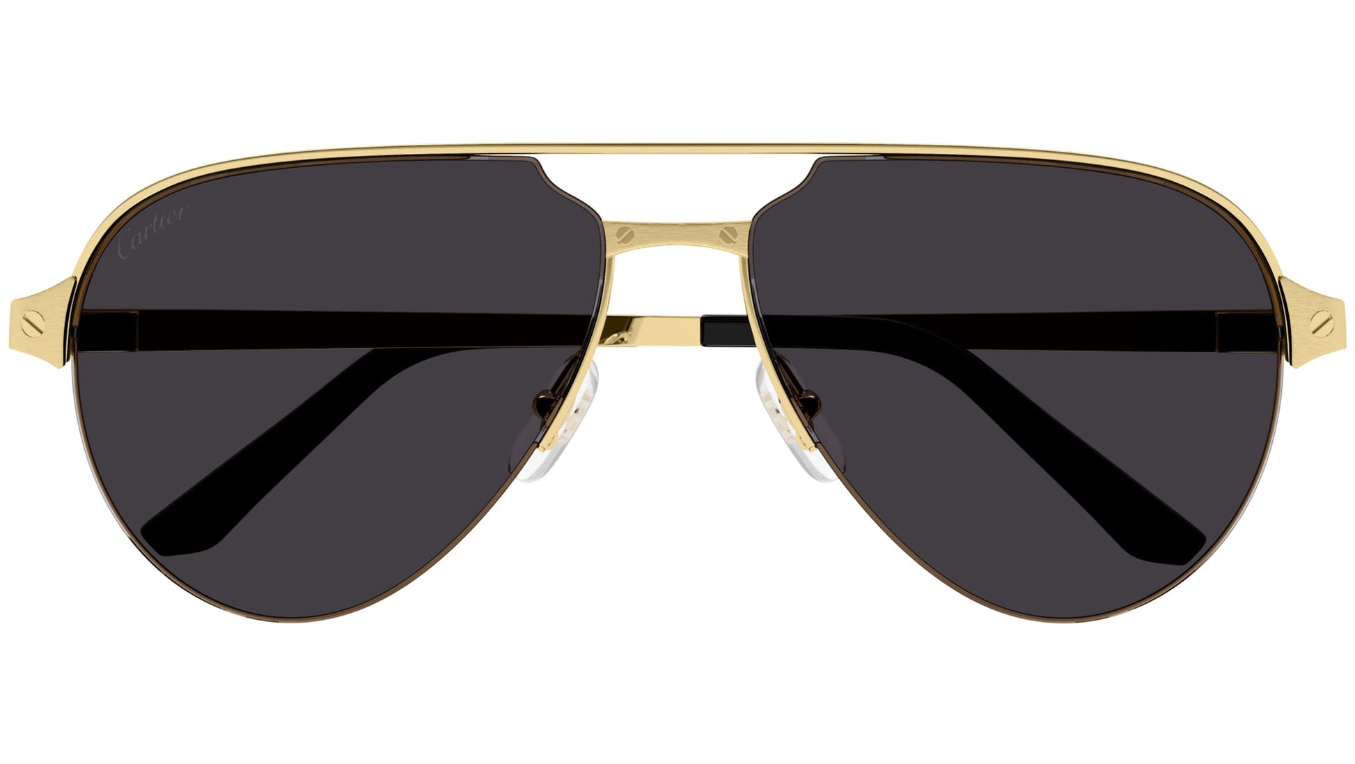 Occhiali da sole Cartier linea Core Range CT0386S 001 con montatura oro finitura smooth e lenti color grigio.
