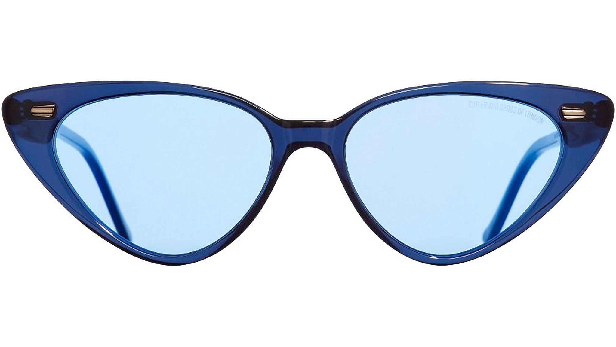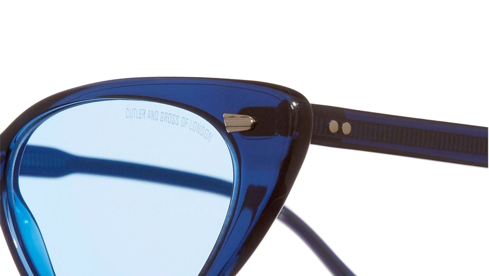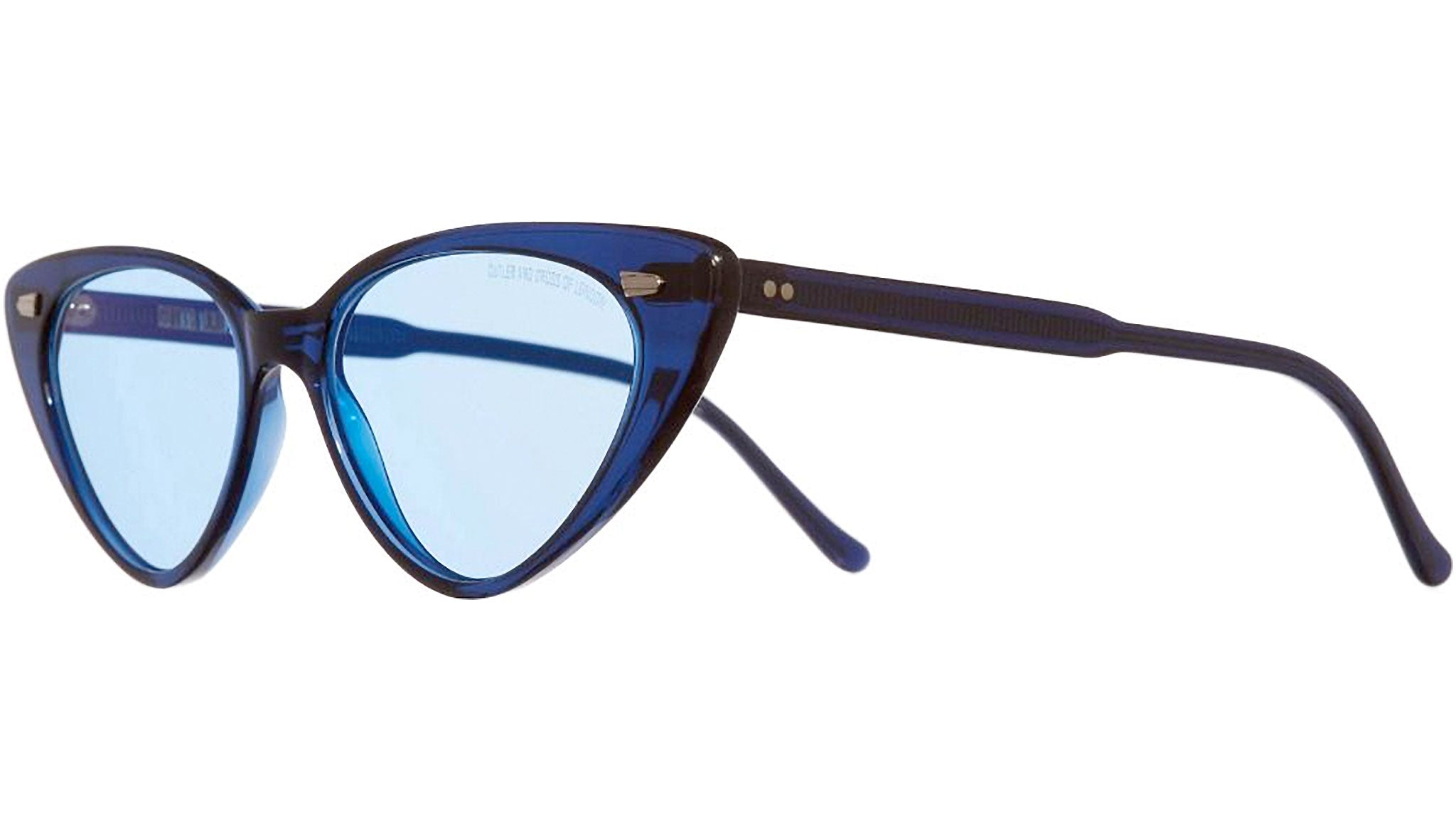 Cat-eye sunglass featuring vintage inspired ribbed pins. Ultra-fine acetate paired with tonal coloured sunglass lenses.