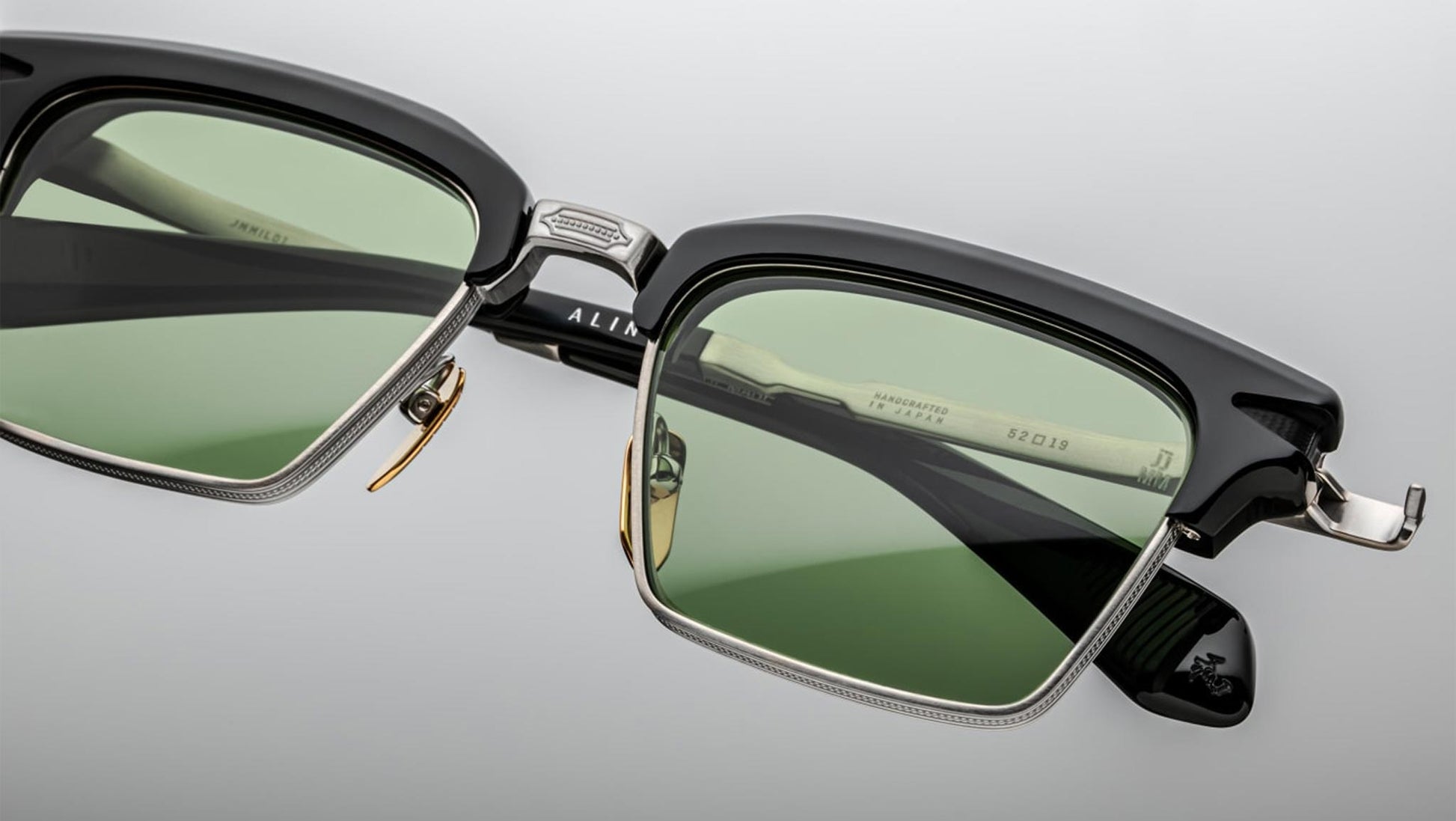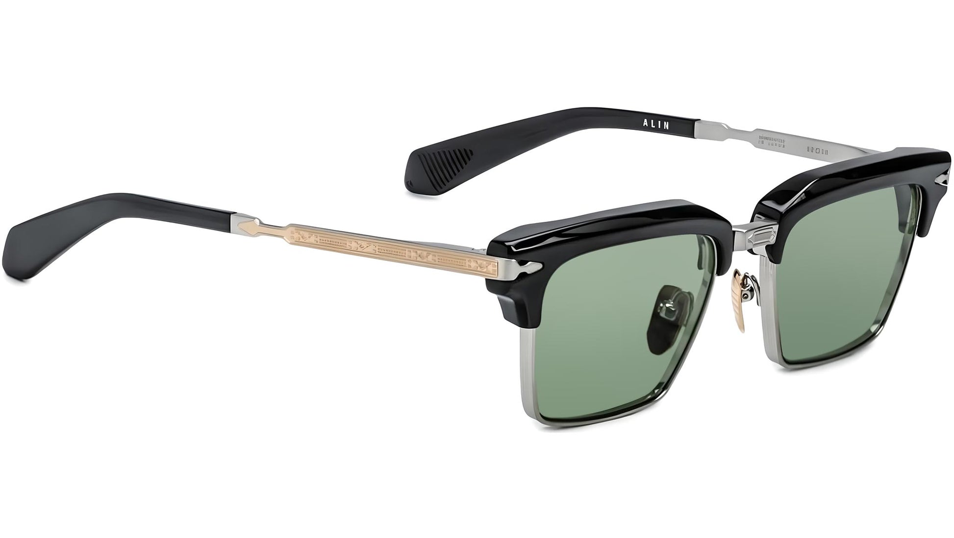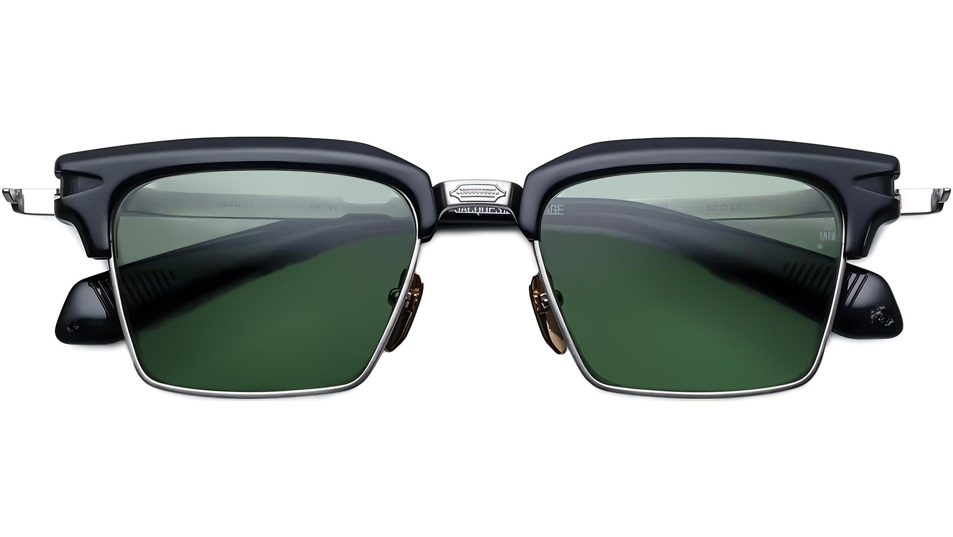 Dark gold 100% beta titanium frame with silver accents, black cured cellulose acetate, and green lenses. Features light gold engraved titanium temples with acetate tips, a silver tension-secured custom arrowhead monoblock hinge, and black cellulose acetate custom nose pads with logo and hairline engraving. Sweetgrass glass 4 base lenses with backside anti-reflective treatment ensure clarity and comfort. Frame shape: medium. Provides 100% UV protection.