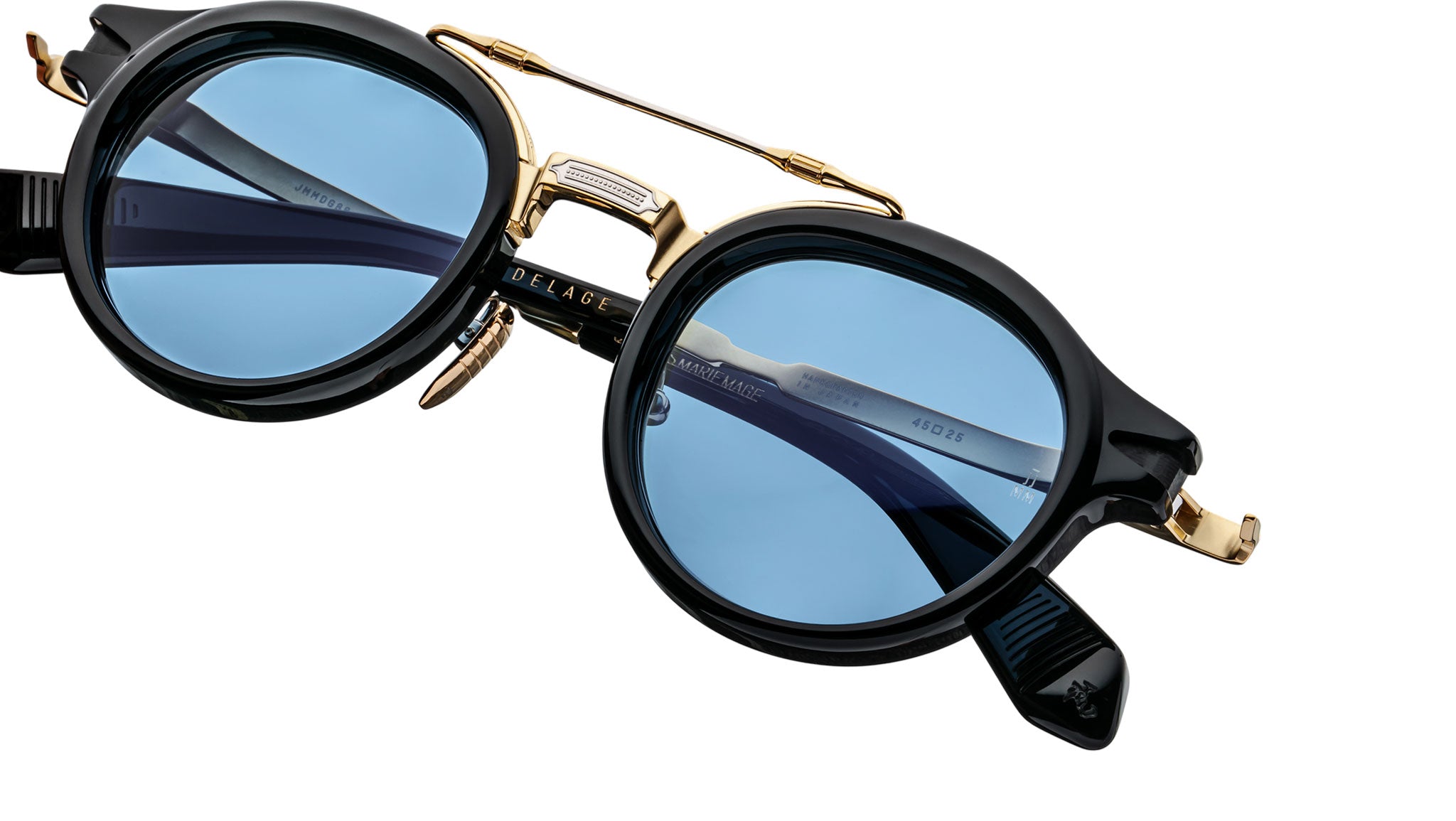 The Jacques Marie Mage Delage is a sophisticated take on circular '50s-inspired combo spectacles. Featuring a bold acetate lens shape paired with a distinct titanium brow bar, these frames are enhanced by the signature arrowhead monoblock hinge and finely engraved temples with a unique arrowhead motif. Drawing inspiration from the fluid lines and fine embellishments of Art Deco, the Delage combines timeless elegance with modern refinement, making it a perfect choice for the self-assured individual with an appreciation for subtle old-world sensibility.