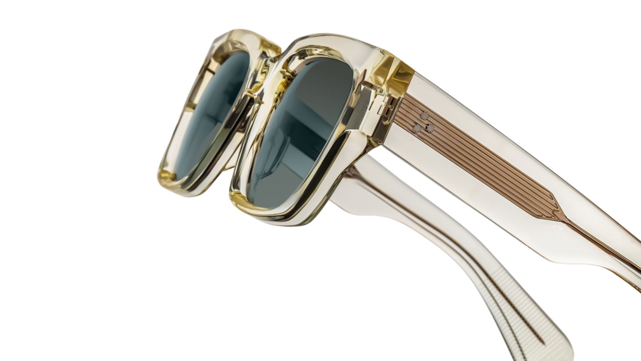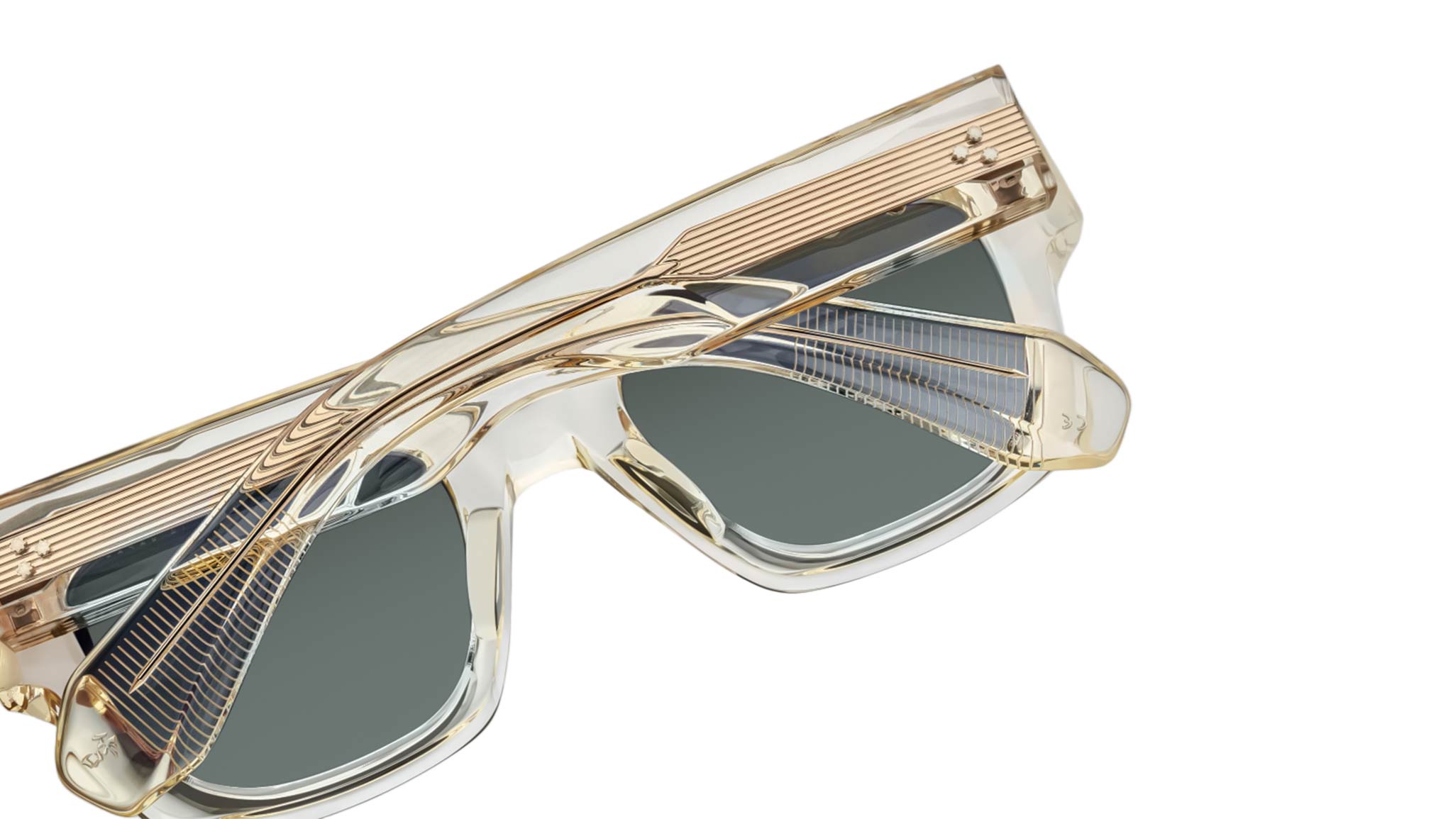 Crafted with a 10mm yellow cured cellulose acetate frame, this eyewear features custom double-laminated acetate temples with precious metal hardware and a light gold arrowhead front pin. The design incorporates an inner light gold wirecore with custom hairline engraving and a light gold tension-secured custom 7 barrel hinge for enhanced durability. Spruce gradient CR-39 lenses in a 6 base curvature offer visual clarity and full UV protection, finished with a backside anti-reflective treatment. Packaging includes a custom hard case, microfiber cloth, and certificate of authenticity.