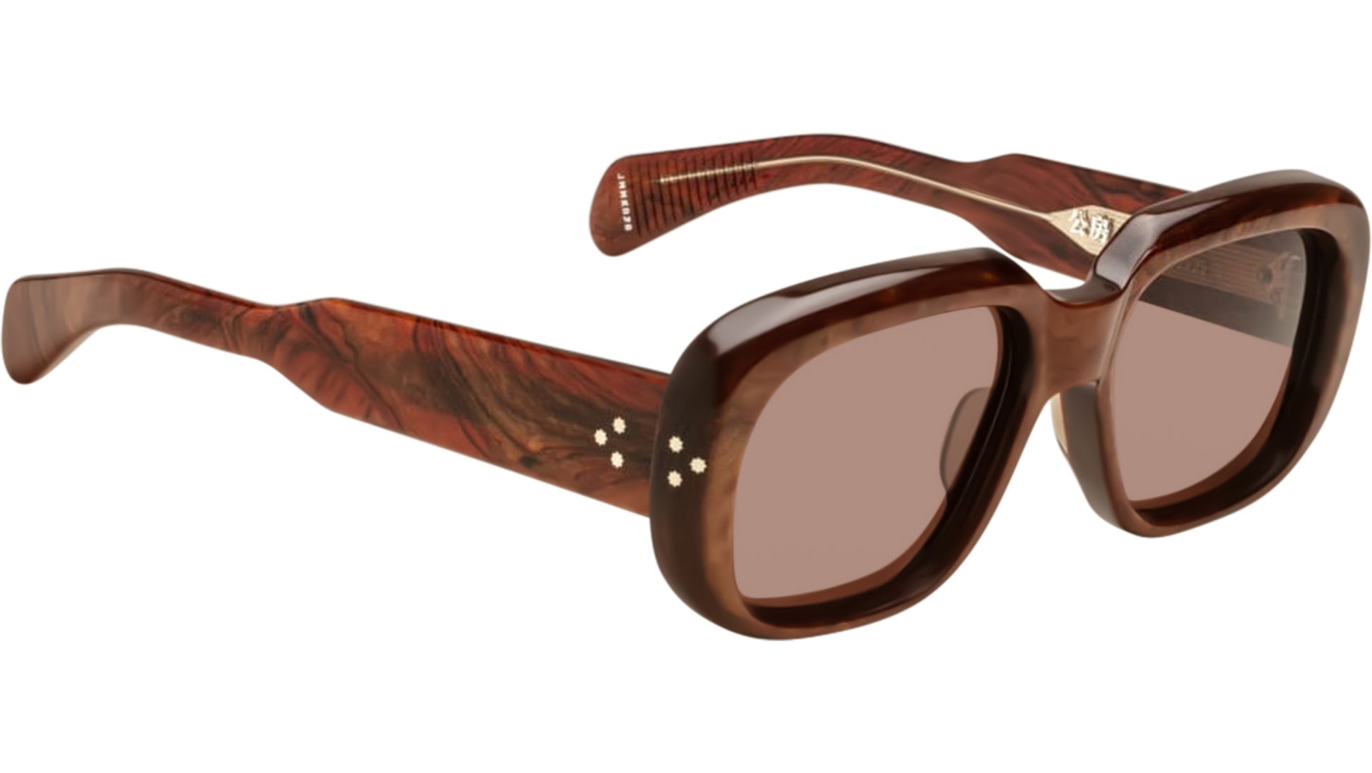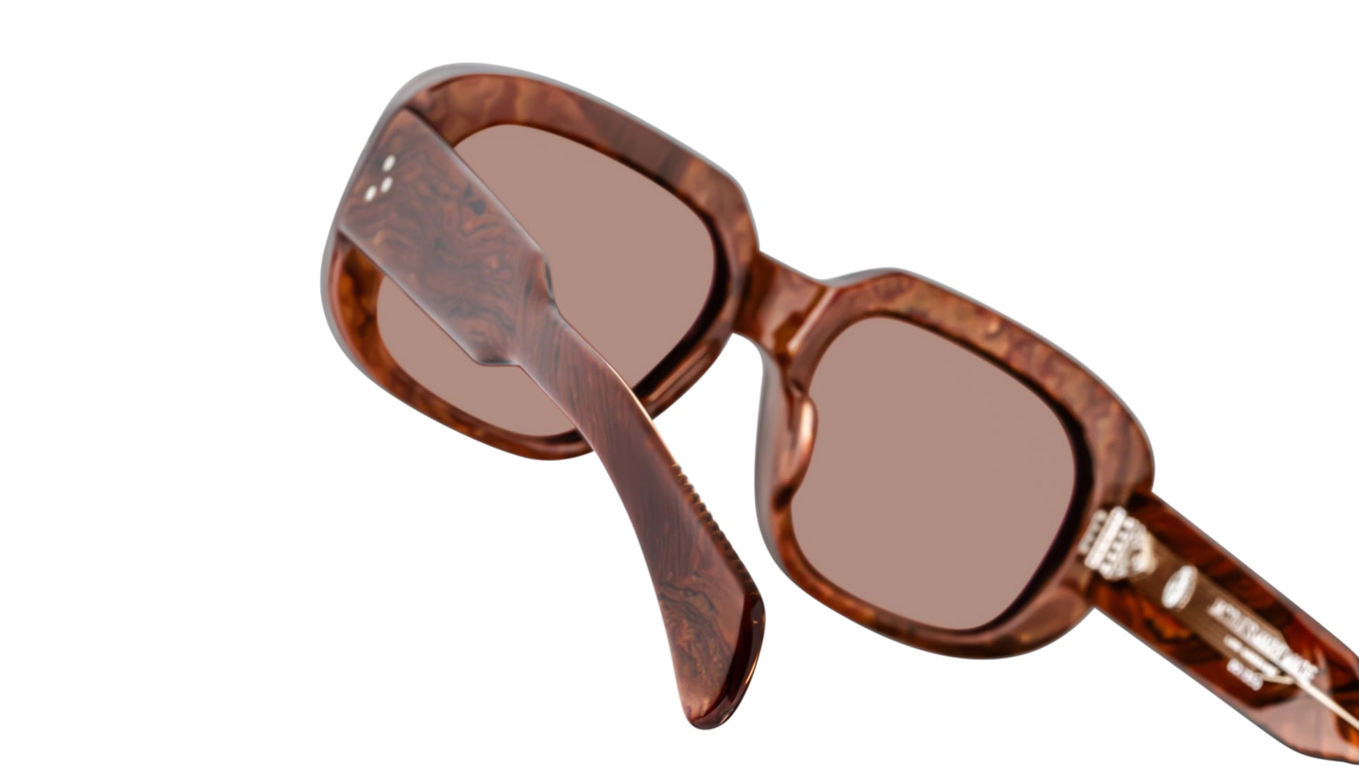 Brown 10mm cured cellulose acetate frame with custom double-laminated acetate temples and brown lenses. Exposed inner temple wirecore. Tension-secured custom 9-barrel hinges. Sweet brown CR-39 4-base lenses with backside anti-reflective treatment.