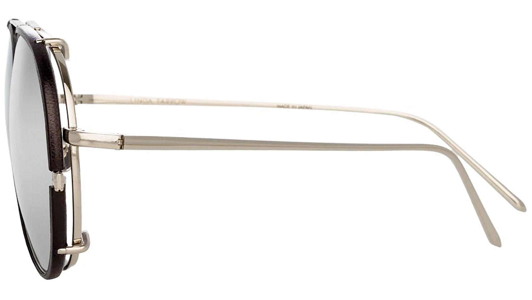 This innovative mens Linda Farrow aviator design can be worn both as a sunglass and an optical glass to suit your style. Crafted from white gold-plated titanium, the sunglass features coordinating precious platinum lenses contoured by a black leather rim, which can be effortlessly clipped onto and off the frame.
