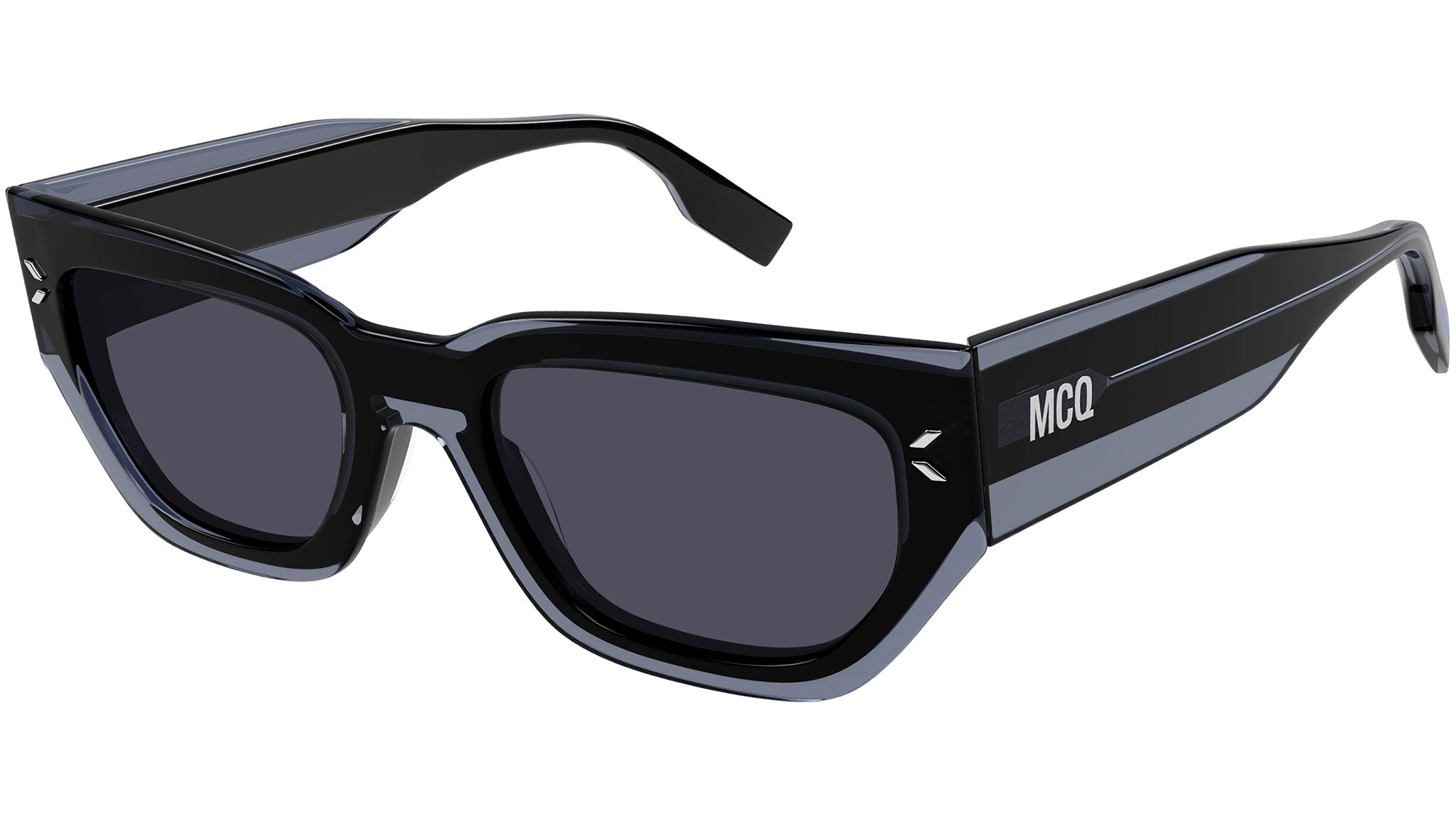 Occhiali da sole McQ linea Icon Zero modello MQ0363S variante colore 001 grigio bilayer trasparente lucido + nero con lenti color grigio fumo tinta unita.