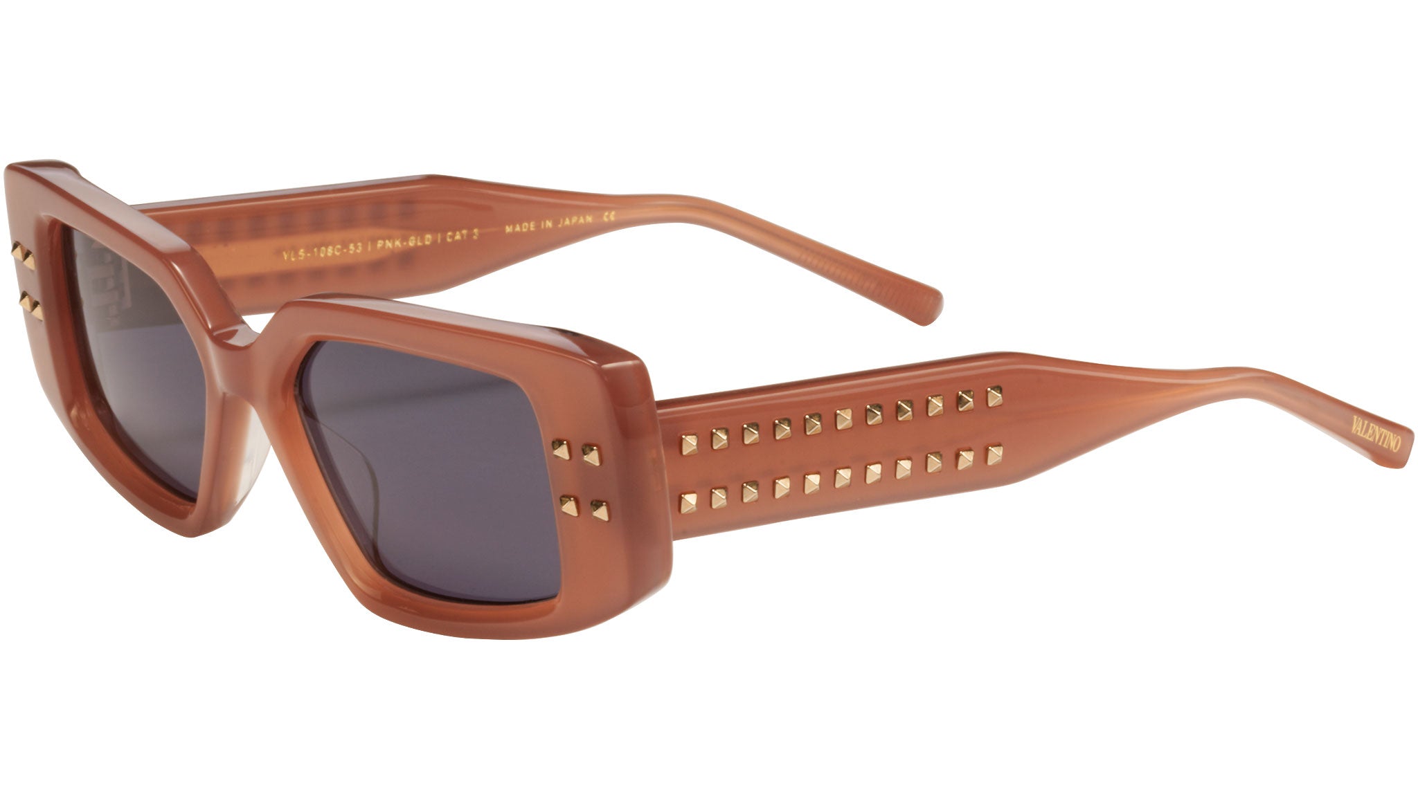 Elementi di design distintivi includono grappoli chic di iconiche borchie Valentino tridimensionali in titanio sul frontale (8) e sulle aste (22), applicate a mano nelle stesse proporzioni generose delle leggendarie borse della Maison.