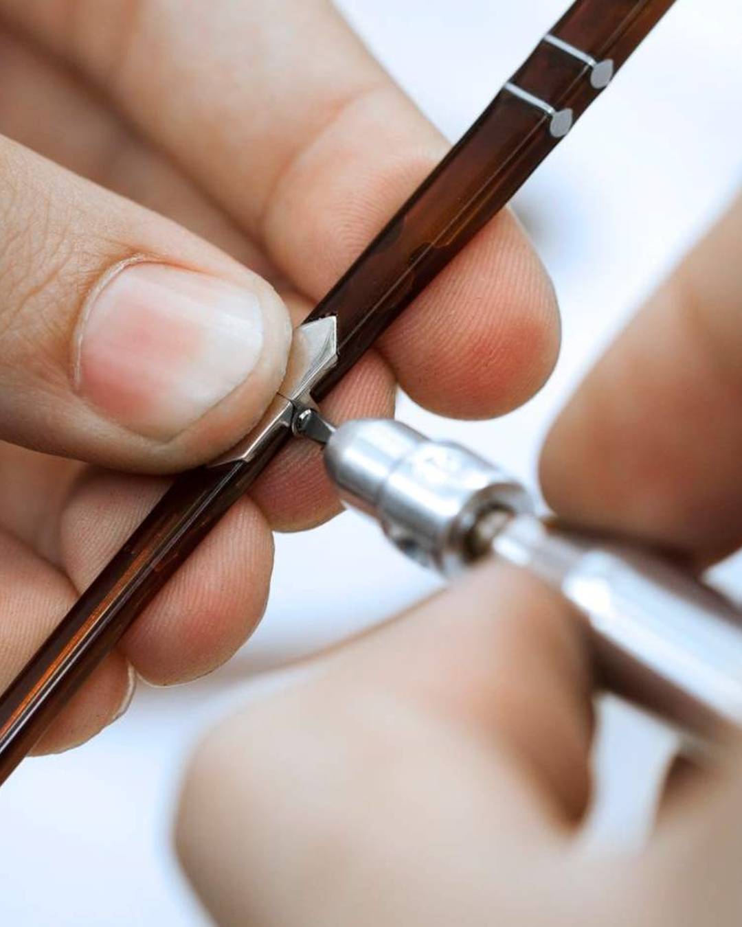 Each pair of Persol glasses goes through more than thirty individual processes — from naturally derived acetate shaping to lens polishing and final inspection.