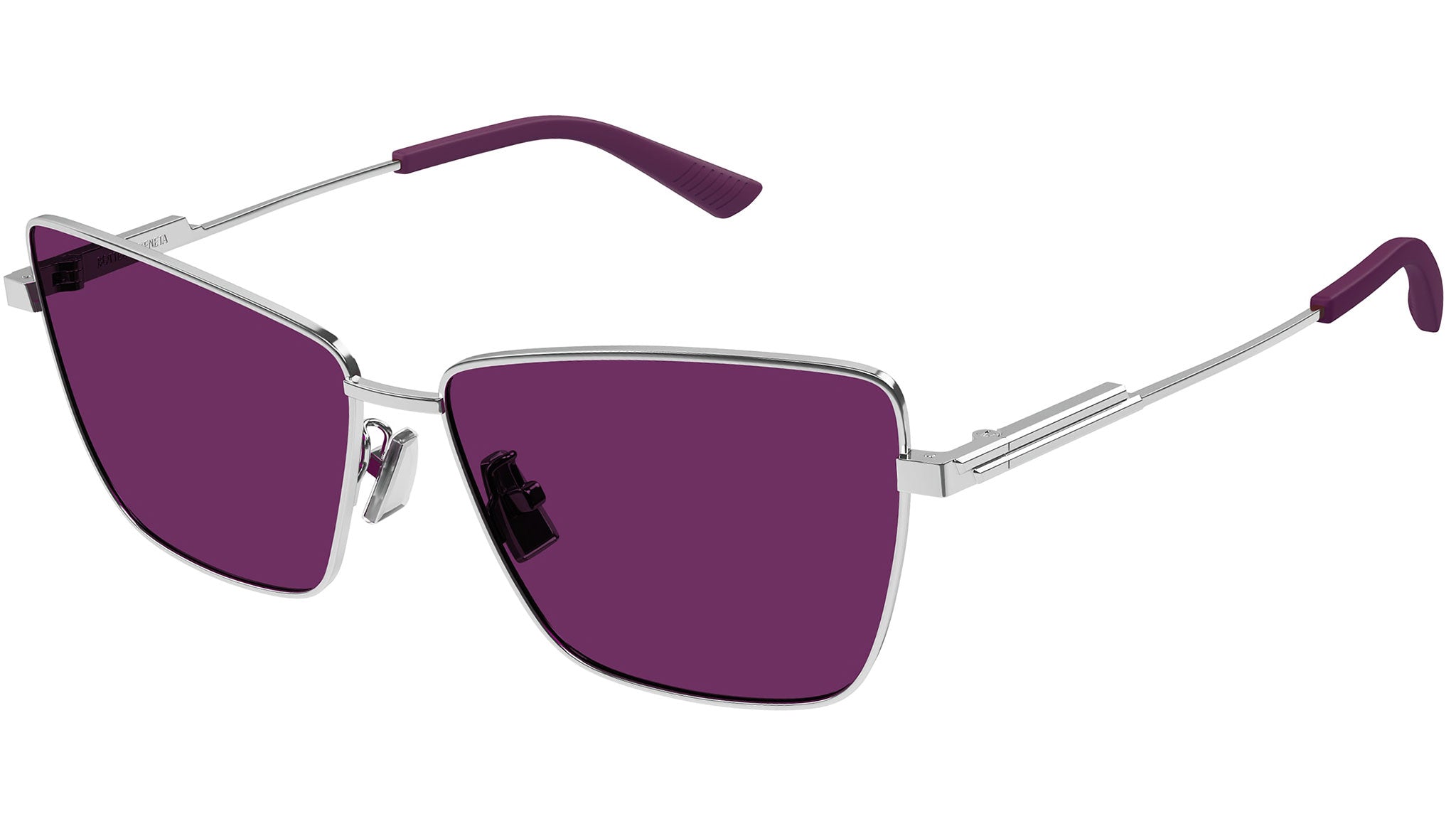 Bottega Veneta Minimalist sunglasses collection model BV1195S color code 003 shiny silver featuring solid burgundy lens.