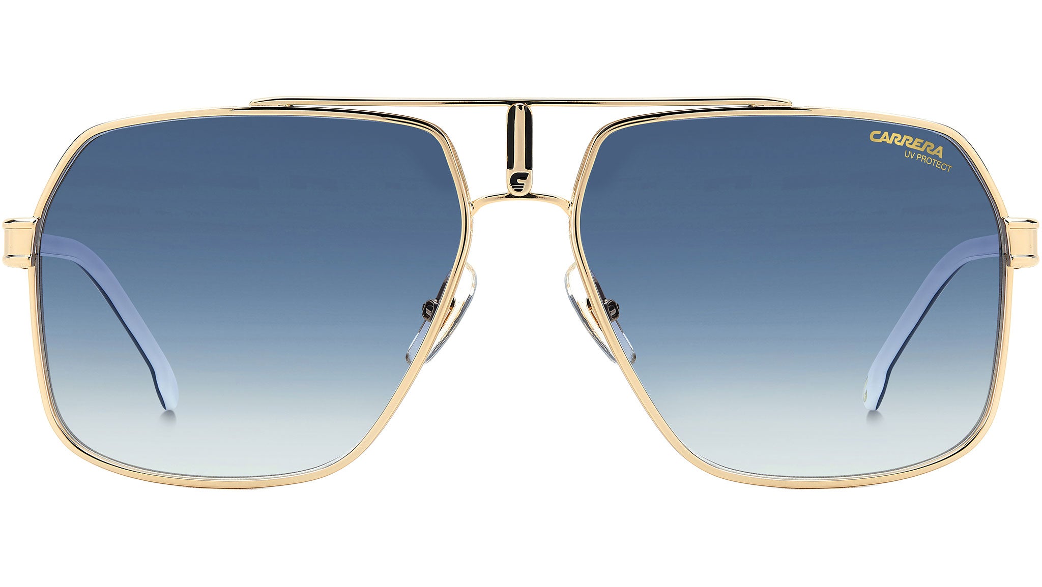 Okulary przeciwsłoneczne Carrera model 1055/S kod koloru J5G 08 Złoto. Te męskie okulary przeciwsłoneczne przekształcają typowe wykończenia Carrera w przyciągające wzrok elementy. Metalowy profil jest ikoniczny ze względu na wzajemne oddziaływanie brył i pustych przestrzeni, co zapewnia podwójny mostek i tabliczka z logo C. Zauszniki wyróżniają się również rzeźbionym wzorem, wypukłym logo i długimi końcówkami z acetatu. Kwadratowe soczewki są dostępne w wersjach gradientowych, polaryzacyjnych lub ultrapolarnych ze złotą powłoką.