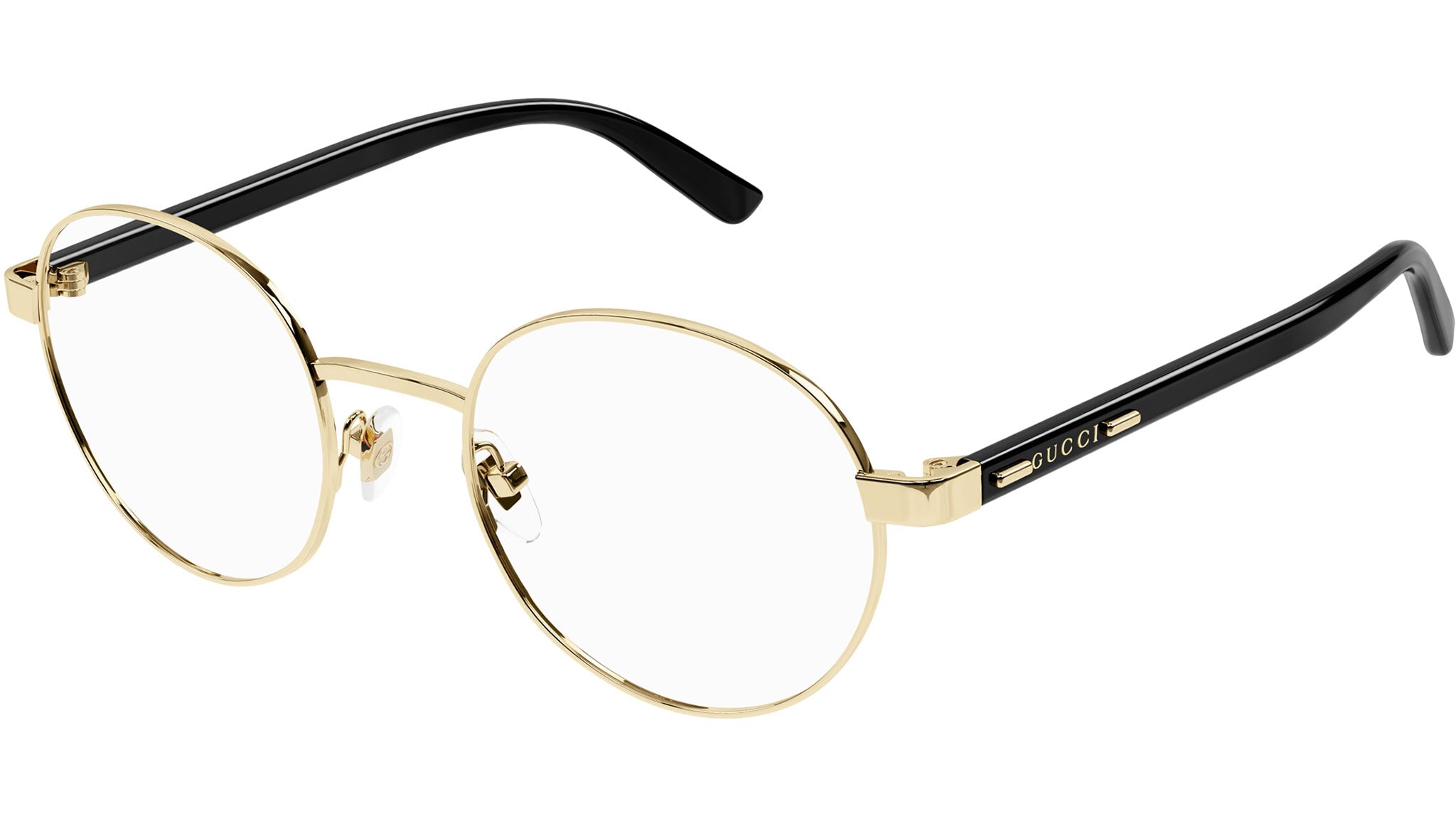 Okulary Gucci Lettering, model GG1585O, metalowe okulary w kolorze panthos, kod koloru 001, błyszczące złoto endura z czarnymi zausznikami i soczewkami demonstracyjnymi.