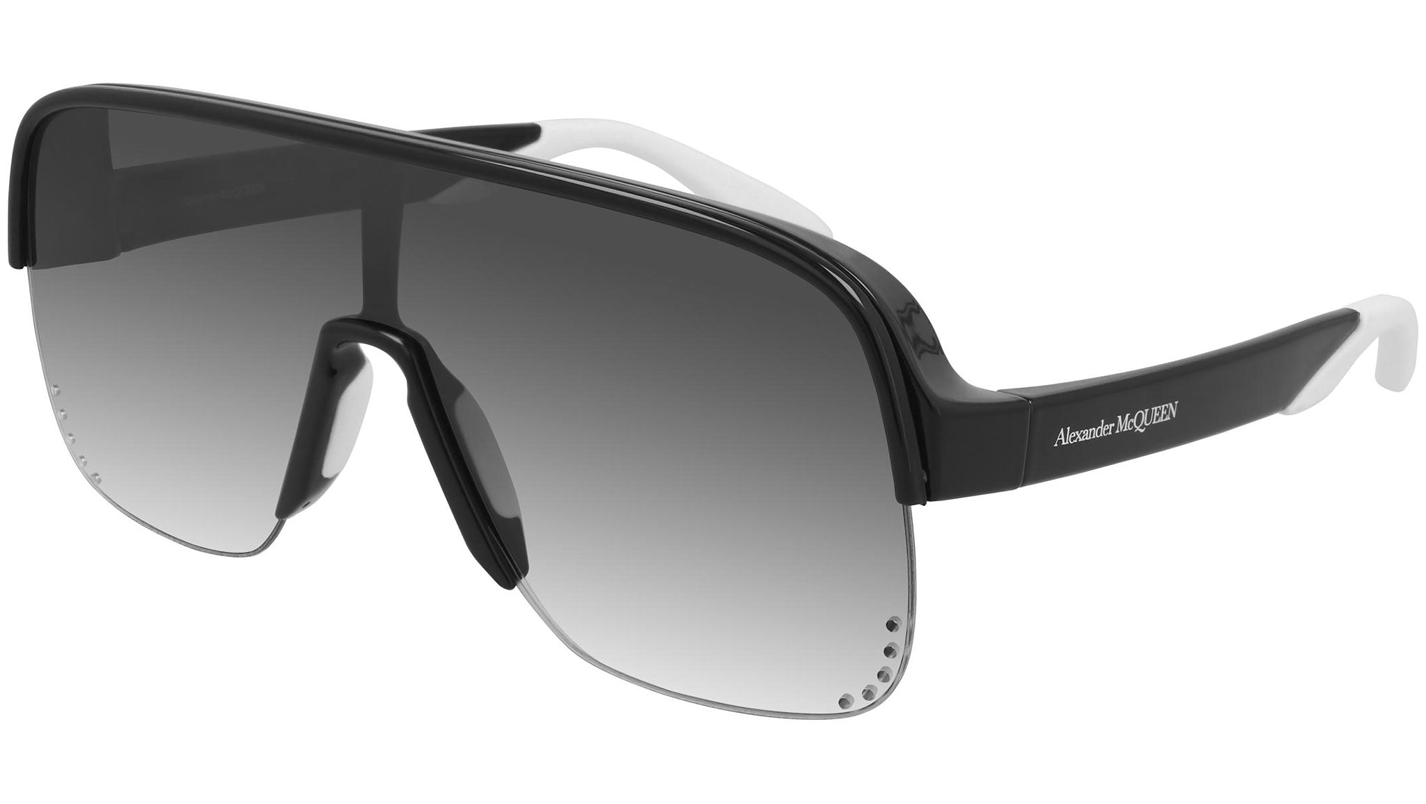 Iconic line AM0294S 002 sunglasses by Alexander McQueen with shiny black and white rubber nose pads frame and gradient grey lens. Alexander McQueen Eyewear eyewear styles represent a juxtaposition between contrasting elements: femininity and masculinity, fragility and strength, tradition and modernity. An innovative and uncompromising identity of the fashion house.