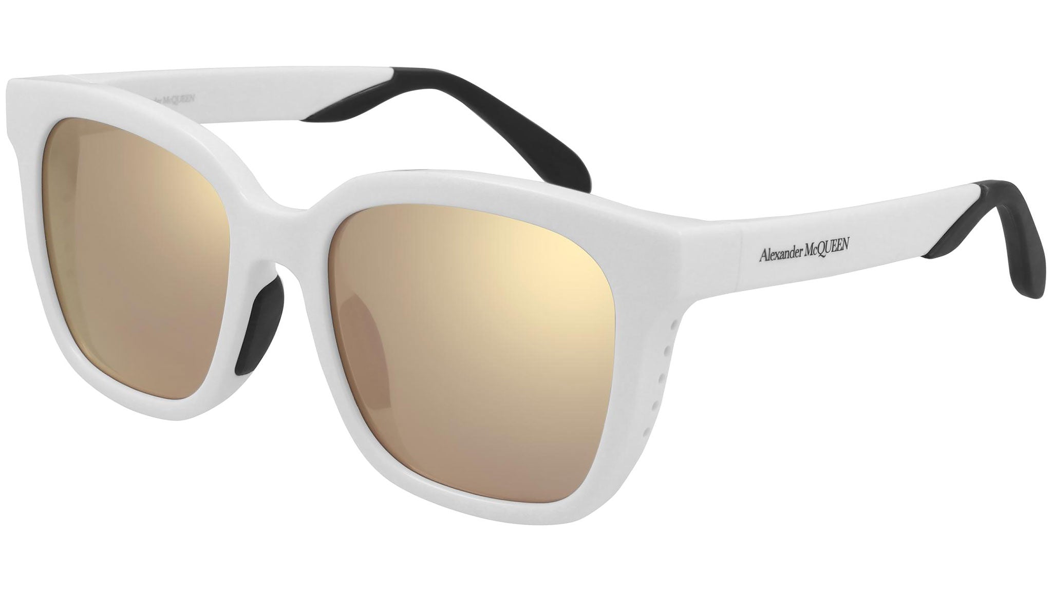 Iconic line AM0295SK 003 sunglasses by Alexander McQueen with shiny white front and black rubber nose pads frame and brown + rose gold mirror lens. Alexander McQueen Eyewear eyewear styles represent a juxtaposition between contrasting elements: femininity and masculinity, fragility and strength, tradition and modernity. An innovative and uncompromising identity of the fashion house.