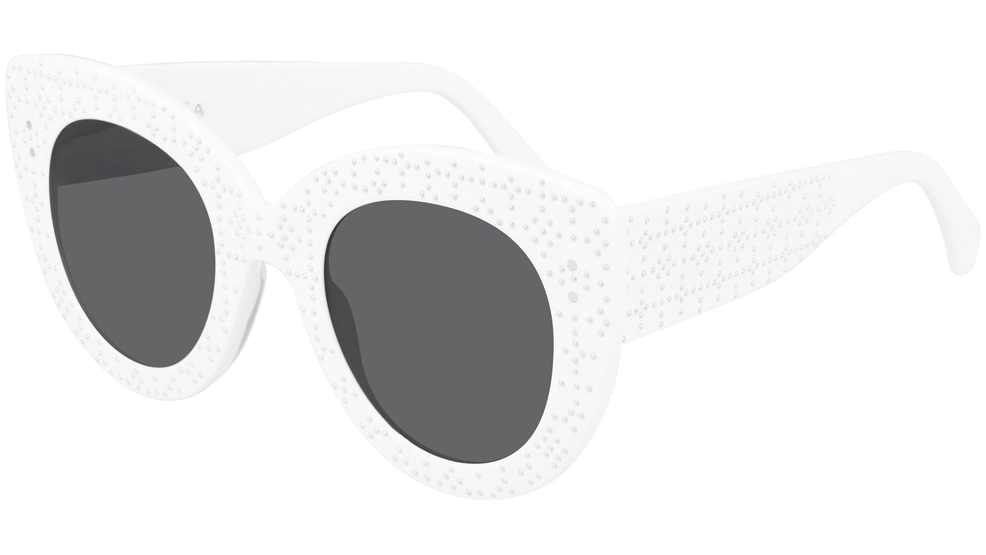 Azzedine Alaïa Pattern line AA0042S 002 sunglasses with shiny solid white frame and solid grey lens. Since its founding, the Parisian atelier of Azzedine Alaïa has maintained a reputation for its originality and unique quality of design. The unique sculptural approach and meticulous craftsmanship of Azzedine Alaïa is again brought forward in the sophisticated and feminine frames of this newest eyewear collection.