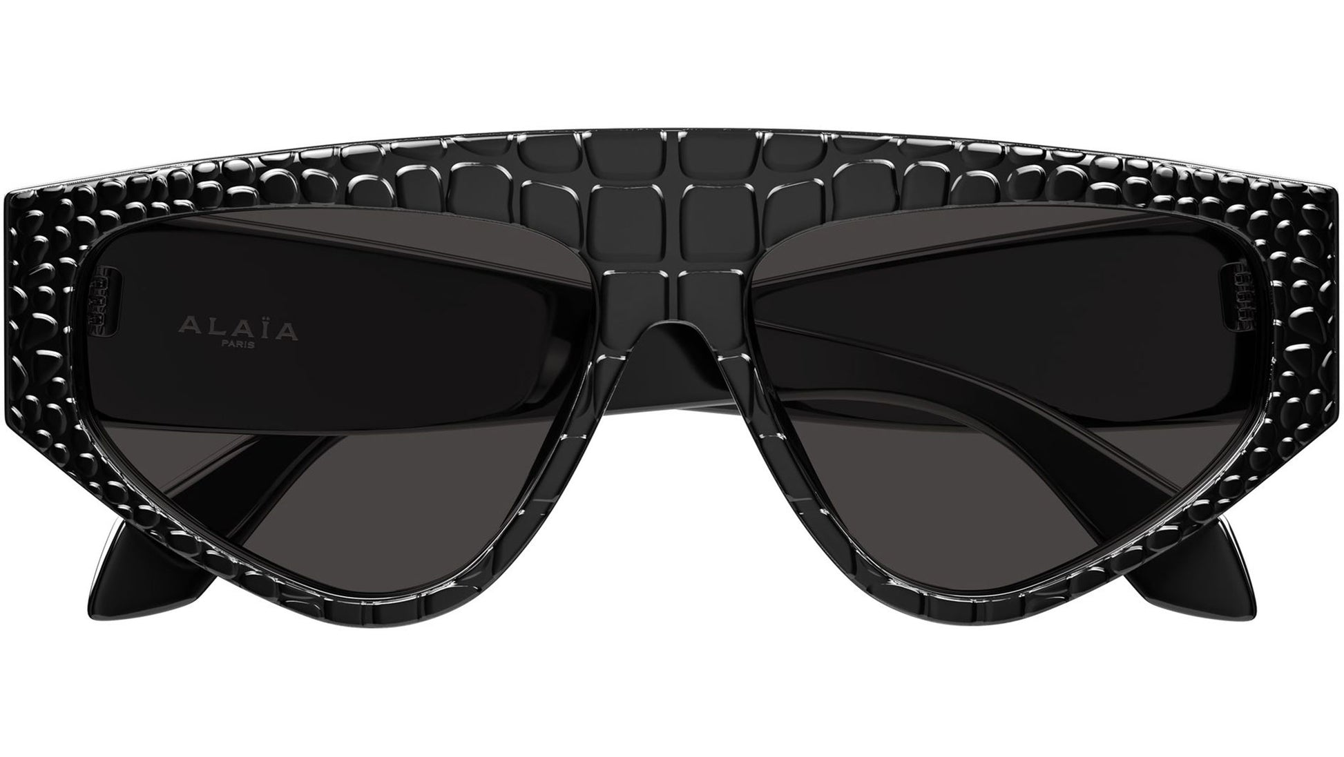 Azzedine Alaïa AA0097S 001 sunglasses for women, featuring shiny solid black with croco texture geometric recycled acetate frame and solid grey bio nylon lenses. Brand line: Azzedine Alaïa. Style code: AA0097S. Color code: 001. Made in Japan. Authorized Azzedine Alaïa online reseller. Your glasses will include the original case and accessories and are covered by a 12-month global warranty.