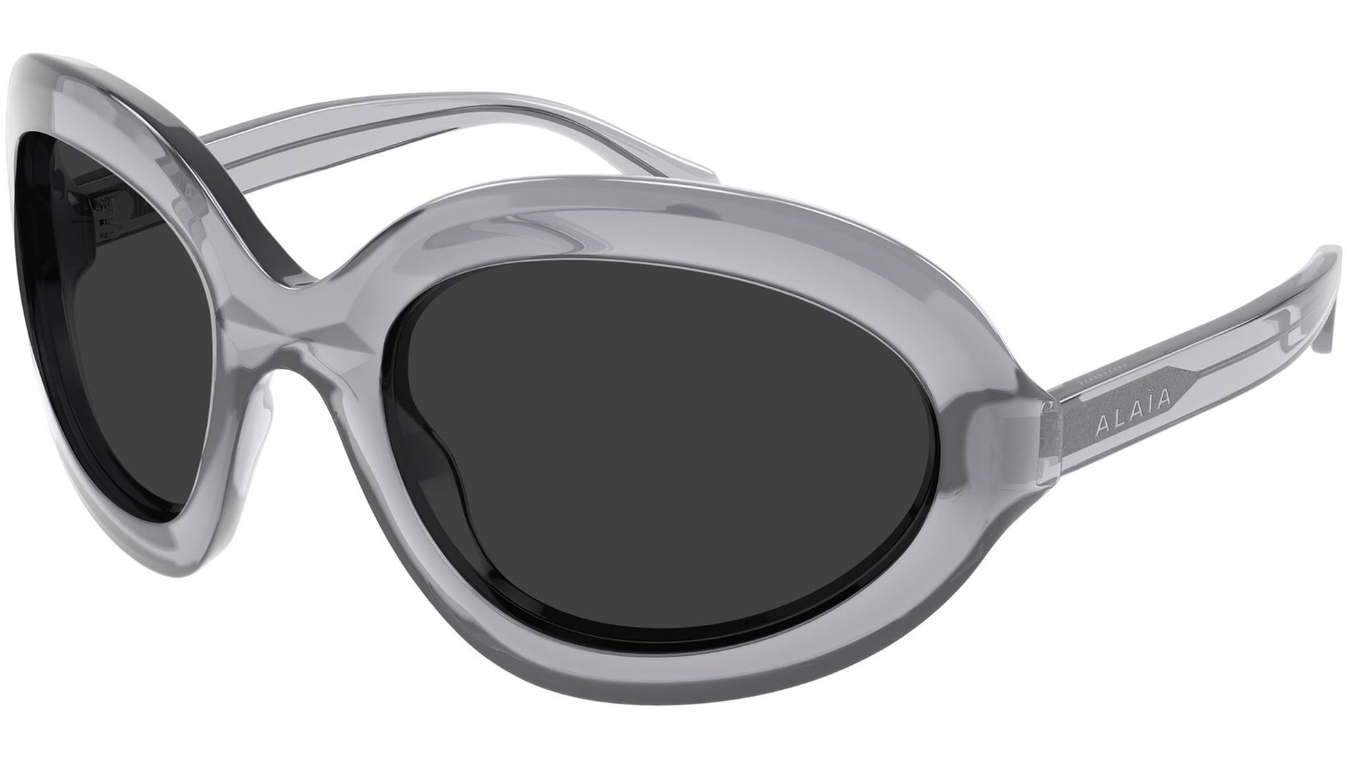 Azzedine Alaïa AA0101S 003 sunglasses for women, featuring shiny transparent light grey panthos recycled acetate frame and solid grey bio nylon lenses. Brand line: Azzedine Alaïa. Style code: AA0101S. Color code: 003. Made in Italy. Authorized Azzedine Alaïa online reseller. Your glasses will include the original case and accessories and are covered by a 12-month global warranty.