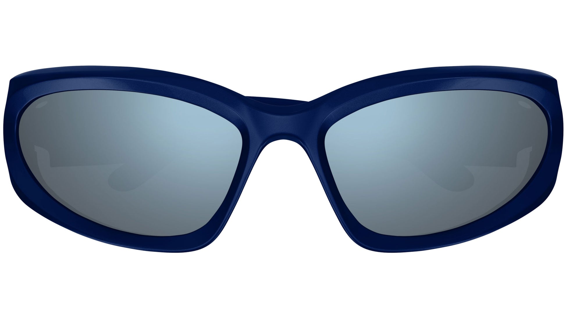 Balenciaga sunglasses model BB0157S from Extreme eyewear line, color code 009 shiny solid metallic blue injection, geometric frame shape with solid blue + mirror blue lens.