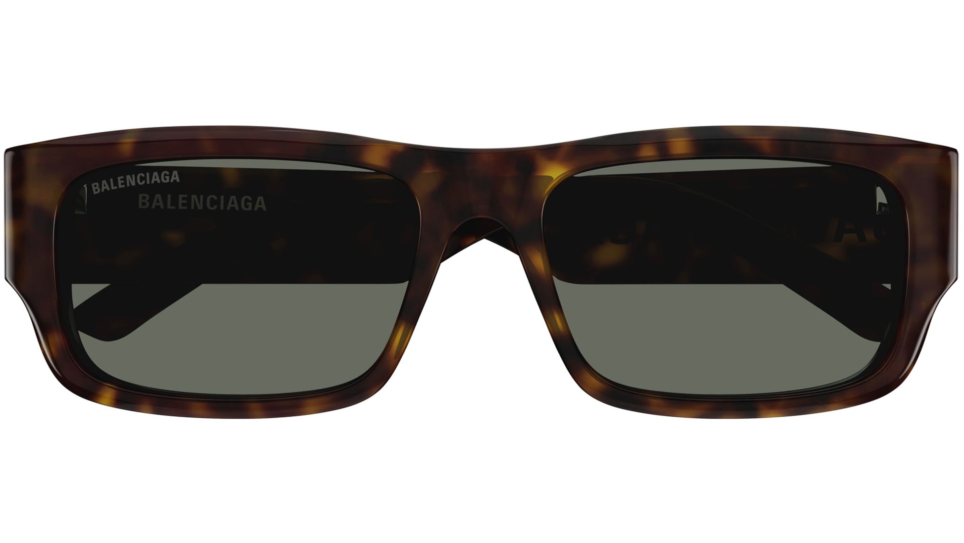 Balenciaga Everyday collection sunglasses model BB0261SA 002 featuring shiny dark havana frame and solid green lens.