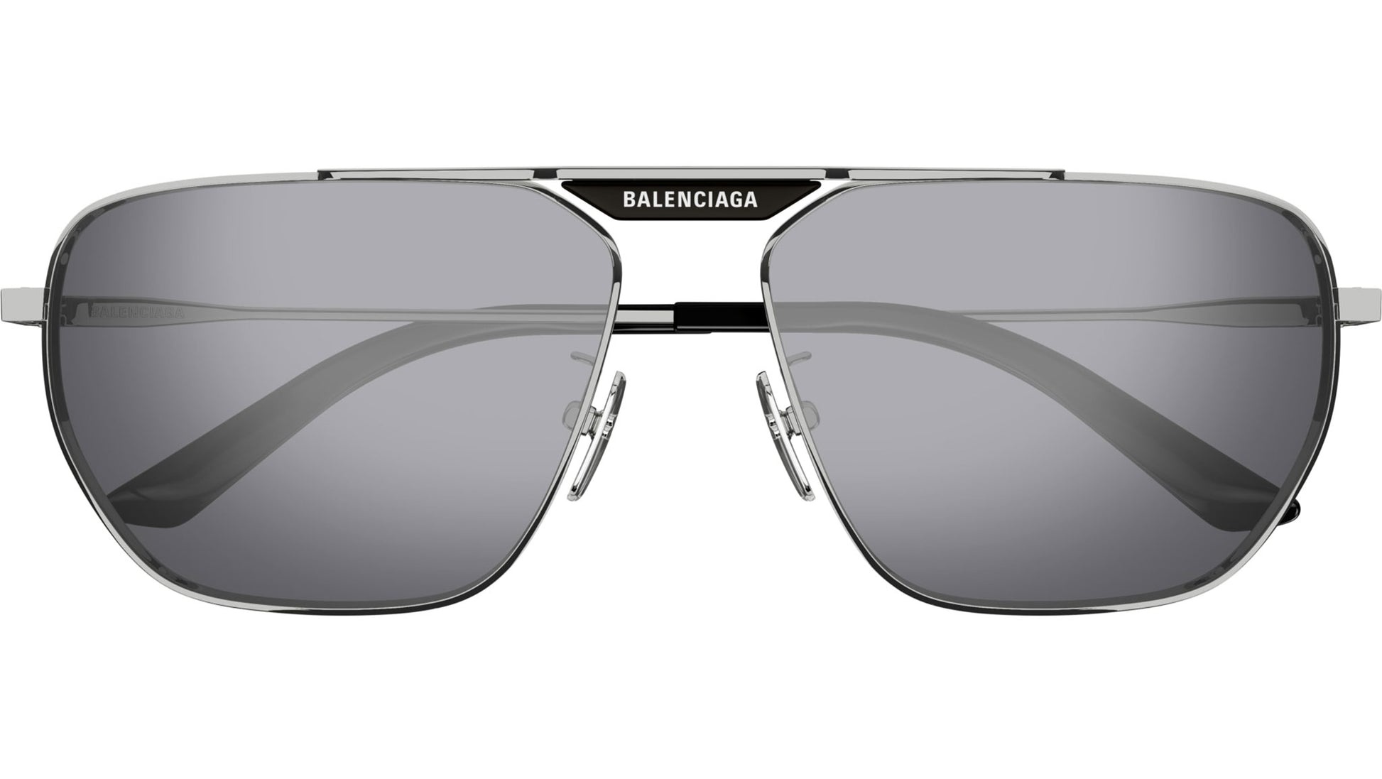 Balenciaga sunglasses model BB0298SA from Everyday eyewear line, color code 003 shiny silver metal, rectangle frame shape with solid grey + flash silver lens.