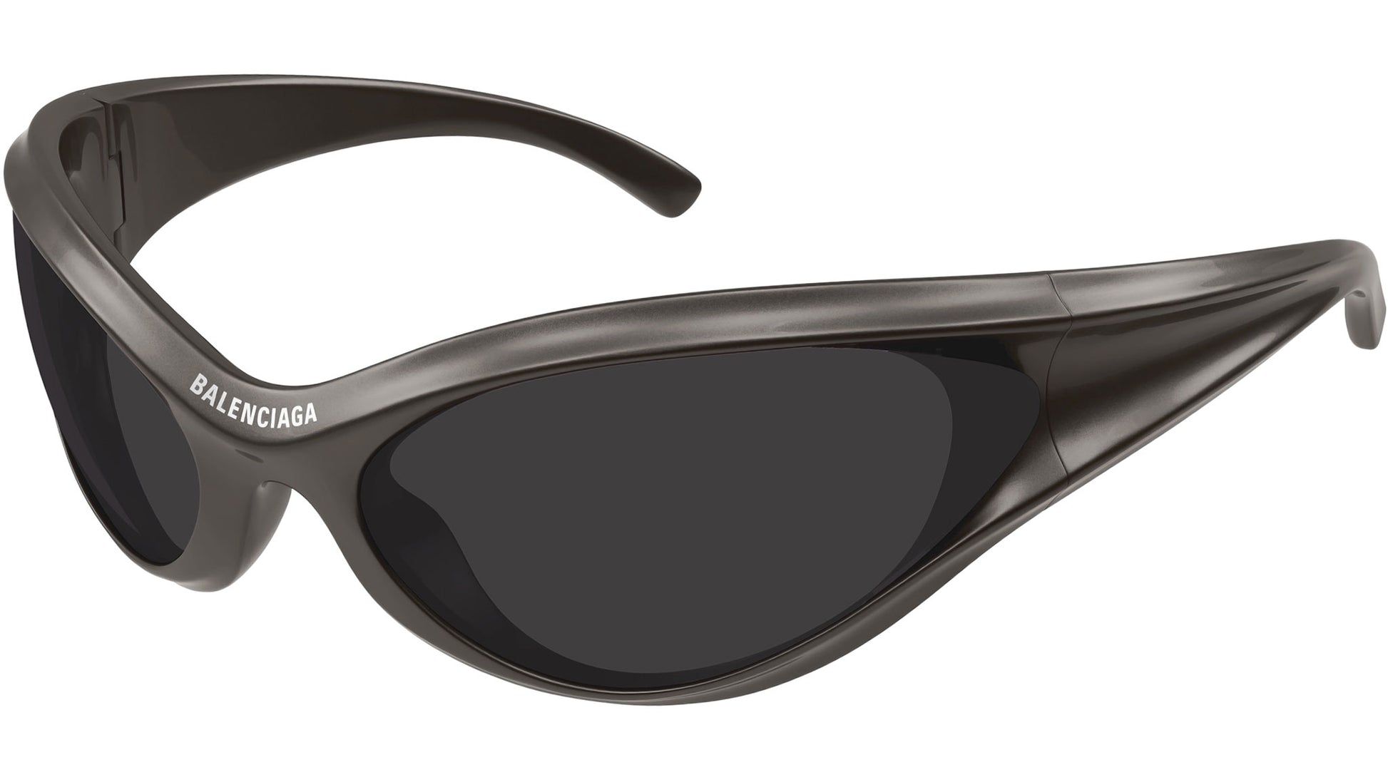 Balenciaga sunglasses model BB0317S from Extreme eyewear line, color code 003 shiny solid metallic warm grey injection, geometric frame shape with solid smoke lens.