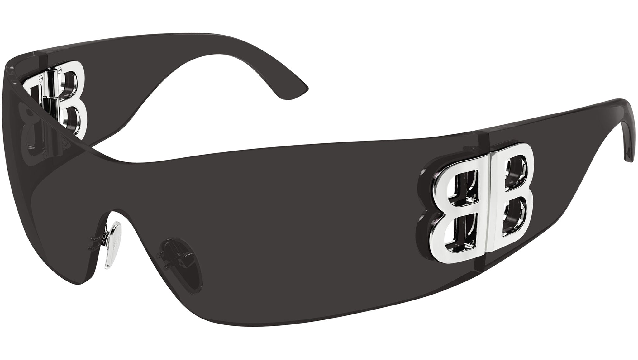 Balenciaga sunglasses model BB0359S from Everyday eyewear line, color code 001 solid grey nylon, shield frame shape with solid grey lens.