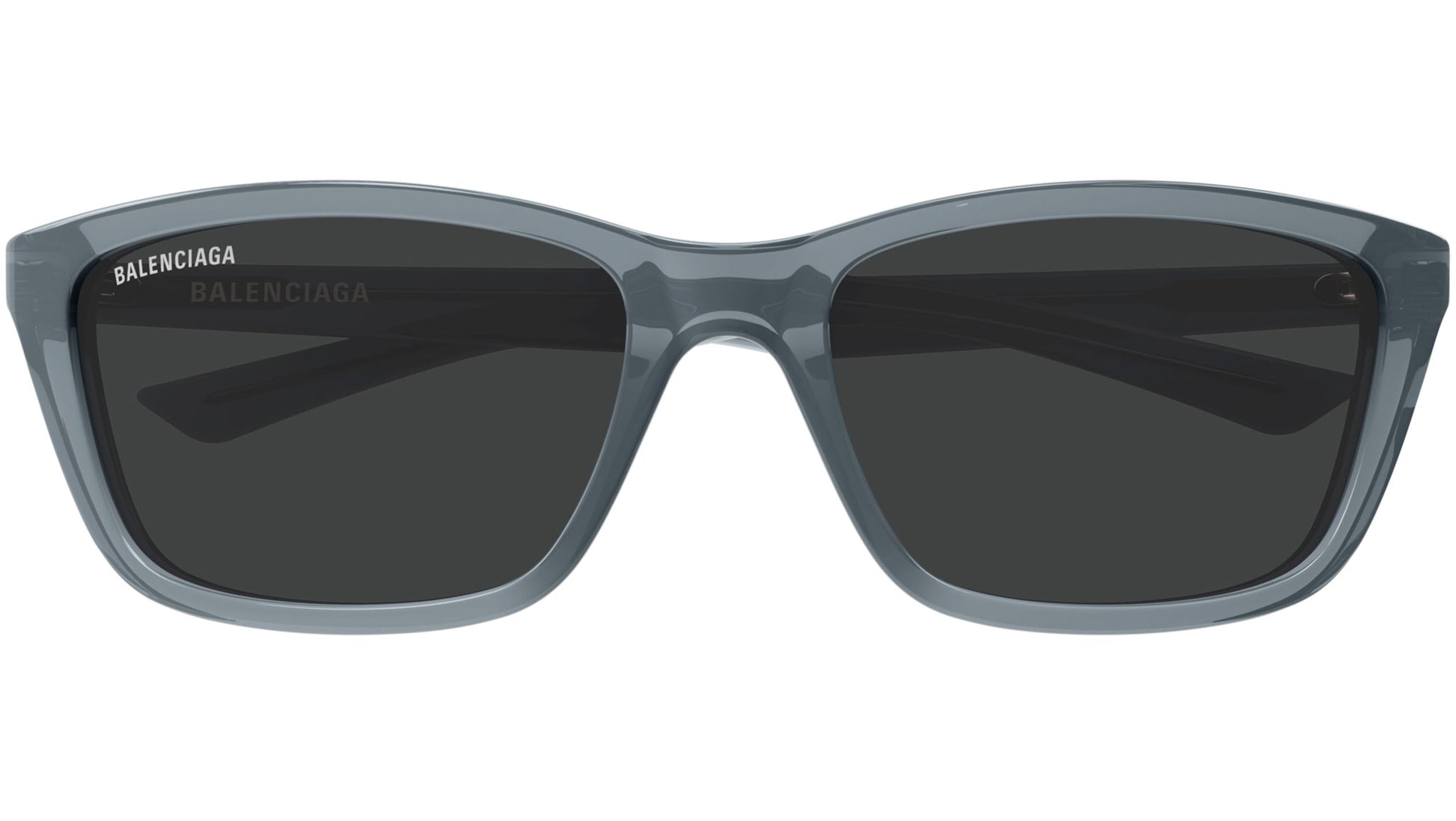 Balenciaga BB0403SK 003 sunglasses for men and woman, featuring shiny transparent grey blue rectangular recycled acetate frame and solid grey bio nylon lenses. Brand line: Everyday. Style code: BB0403SK. Color code: 003. Made in Italy. Authorized Balenciaga online reseller. Your glasses will include the original case and accessories and are covered by a 12-month global warranty.