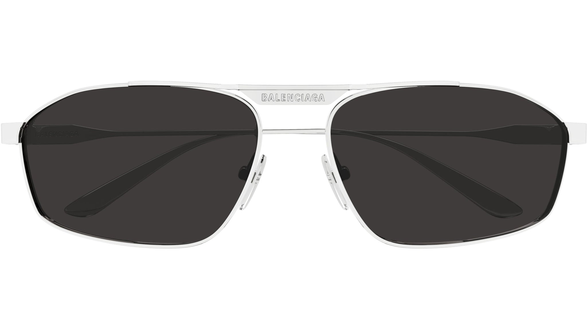 Balenciaga BB0416S 002 sunglasses for men, featuring shiny silver pilot metal frame and solid grey bio nylon lenses. Brand line: Everyday. Style code: BB0416S. Color code: 002. Made in Japan. Authorized Balenciaga online reseller. Your glasses will include the original case and accessories and are covered by a 12-month global warranty.