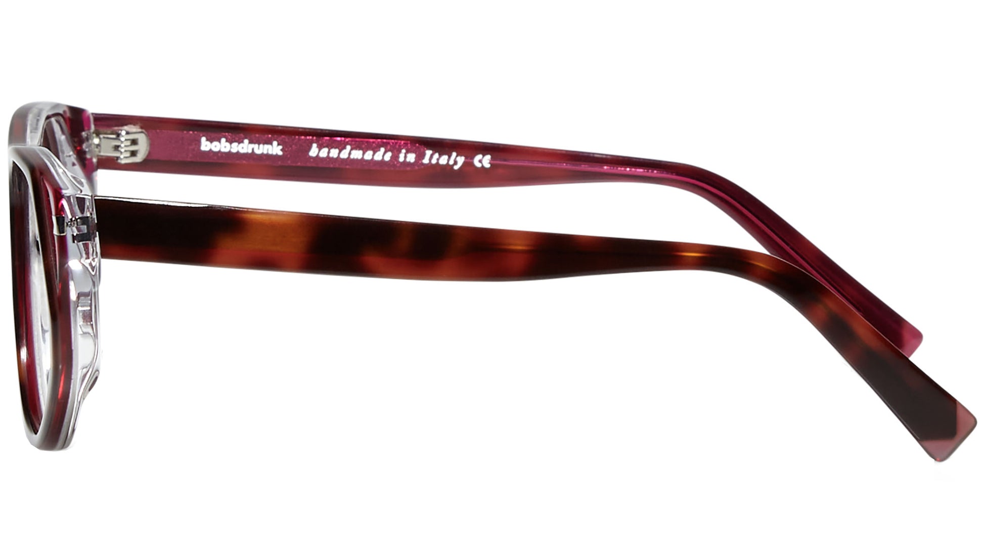 Bobsdrunk Carmen optical model in 547 color variant, violet toroise / violet. Timeless products and bold shapes coexist in this 2023 optical collection. The lines are masterfully designed to create a “bold lightness” effect.Every pair of glasses is characterized by an emblematic detail shown on the front and on the temple tip, which highlights the value of the brand. The detail represents the union of the initial and final letter of Bobsdrunk in a single symbol. The careful choice of materials, the selection of workmanship and the extensive chromatic research are the prerogatives for every Bobsdrunk creation.