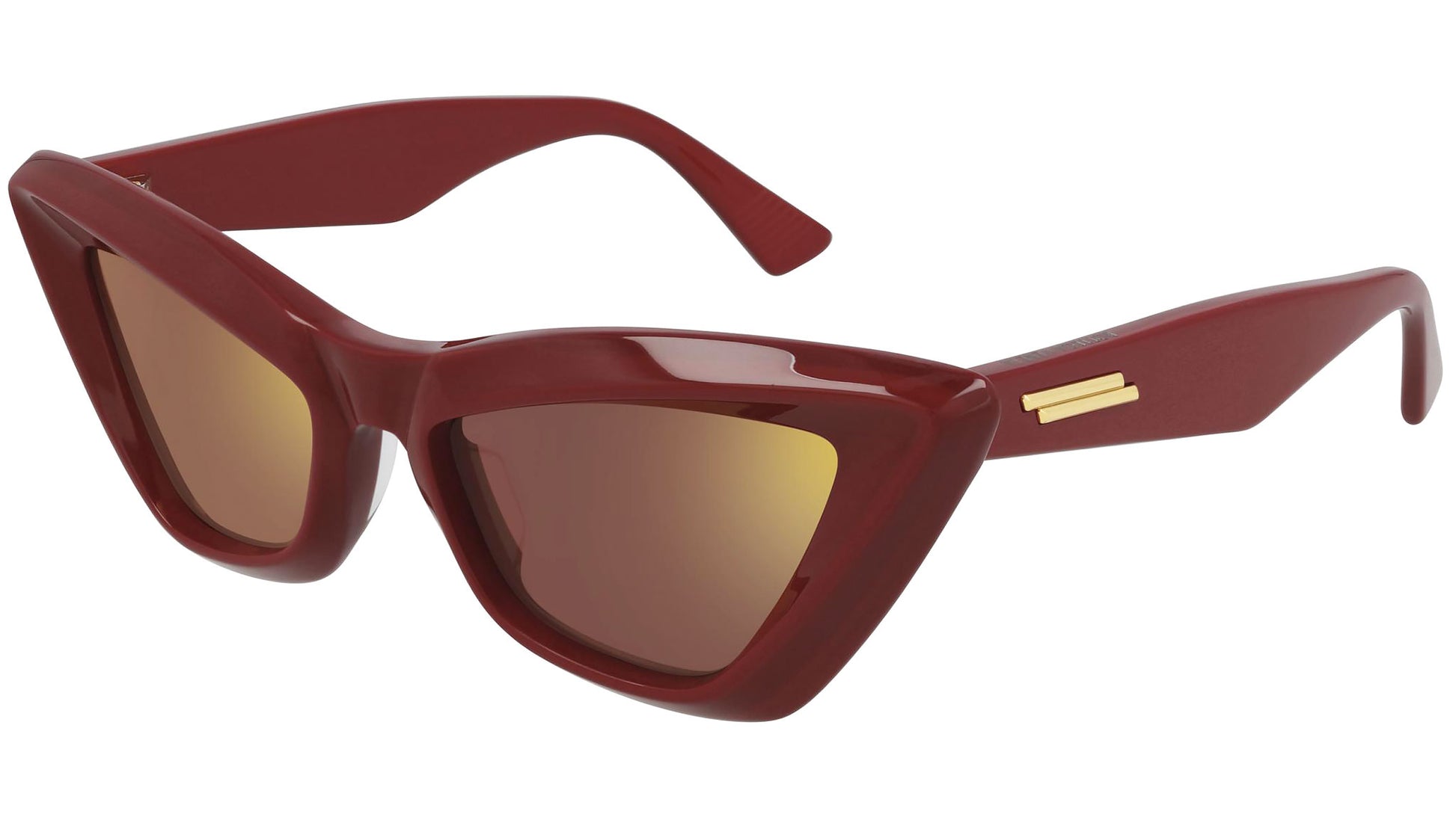 Bottega Veneta Minimalist BV1101S 005 sunglasses with shiny solid red frame and solid brown + multilayer mirror amaranthine lens.