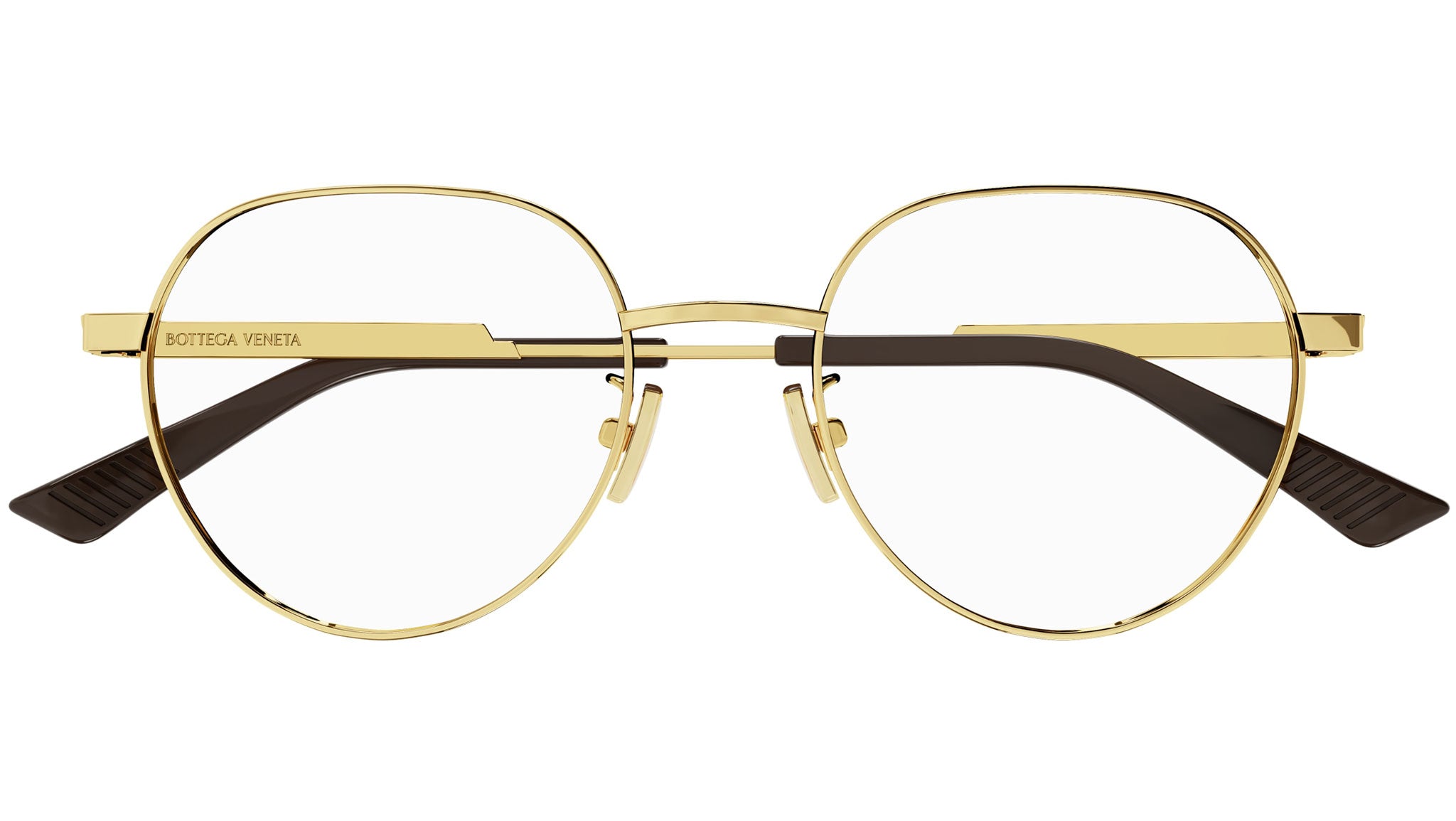 Bottega Veneta Minimalist optical collection model BV1239O color code 002 shiny gold featuring gold temple.