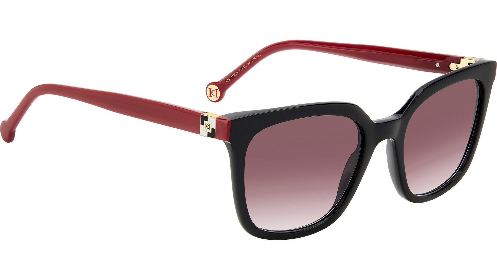 Carolina Herrera sunglasses model HER 0236/S color code OIT black red. Square full rim acetate frame for women with pink doubleshade lens. Authorised Carolina Herrera Online Reseller. Your glasses will come including the original case and accessories and will be covered by 12 month global warranty.