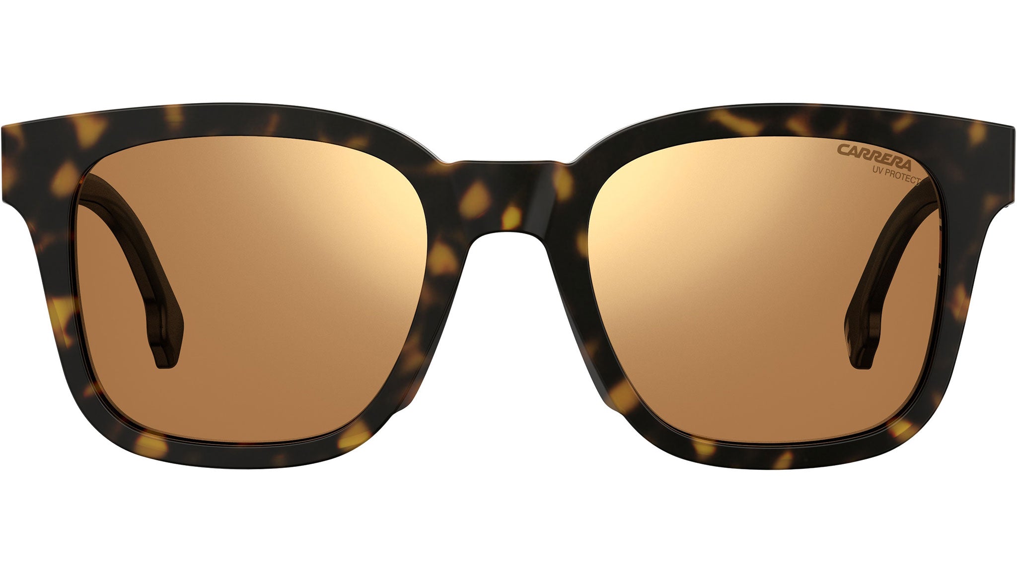Carrera sunglasses model 164/S color code 086 Havana. Instantly recognizable but wonderfully understated, these classic square sunglasses for women from Carrera’s Spring/Summer collection perfectly embody the label’s sleek design aesthetic, combining traditional skilled craftsmanship with a curt, modern silhouette. Expertly made from a black and tortoiseshell Optyl, these timeless thick frames are adorned with the iconic Flag stripes on the outer edge - the brand’s trademark motif inspired by Carrera’s ski-jumping “Bullet” helmet. Impeccably finished with the label’s logo at each temple, as well the signature ‘C’ inside the left end tip, this solid yet sophisticated pair is fitted with mirrored bronze lenses that banish harmful rays and shield tired eyes. The result? Everything a pair of everyday spectacles should be.