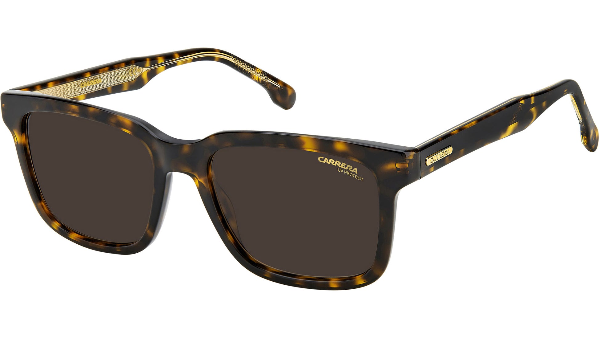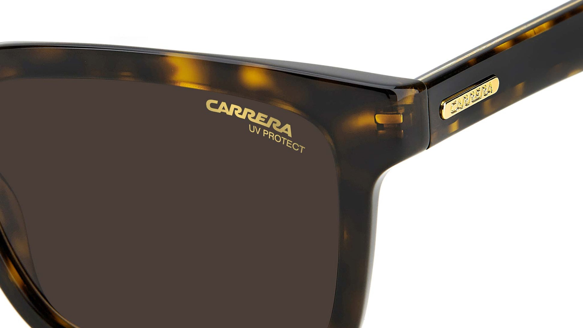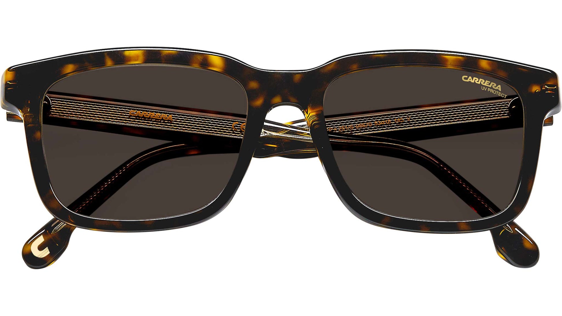 Carrera sunglasses model 251/S color code 086 Havana. With their full-rim square frames and a chunky acetate construction, these sunglasses won’t go unnoticed in a crowd. The classic silhouette is given a touch of individuality with Carrera’s signature logo plaque on the temples and the metal wire core that remains subtly visible on the inner arms. The perfect choice for men who favor elegant simplicity with a twist.