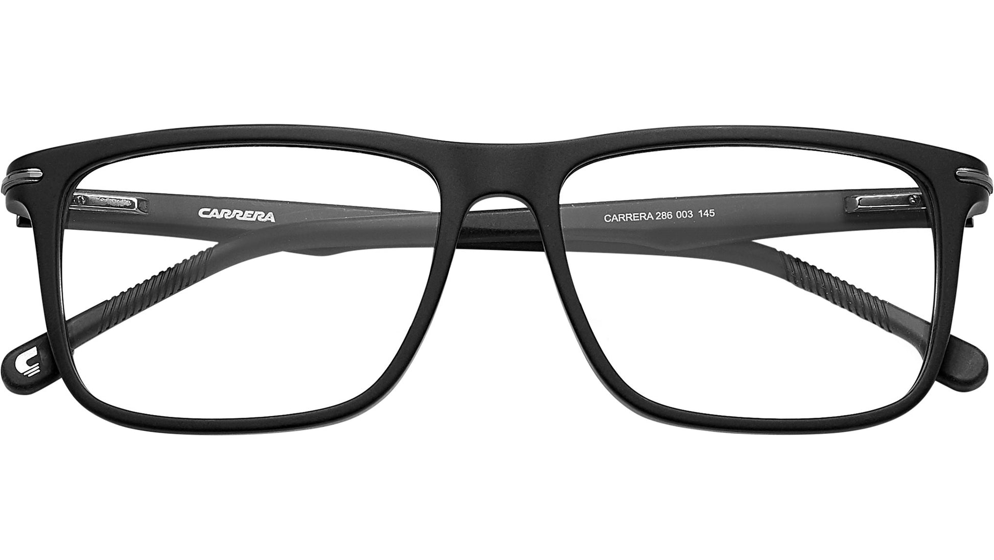Carrera optical frame model 286 color code 003 Matte Black. A classic silhouette infused with urban flair - these prescription glasses showcase Carrera’s unique expertise and craftsmanship. Constructed with a rectangular acetate frame, it’s the small design features that make a difference: note the signature ‘grid’ texture on the inner end tips and the unique heritage-inspired temples. A set of interchangeable flex hinges guarantees comfort, durability, and easy maintenance.