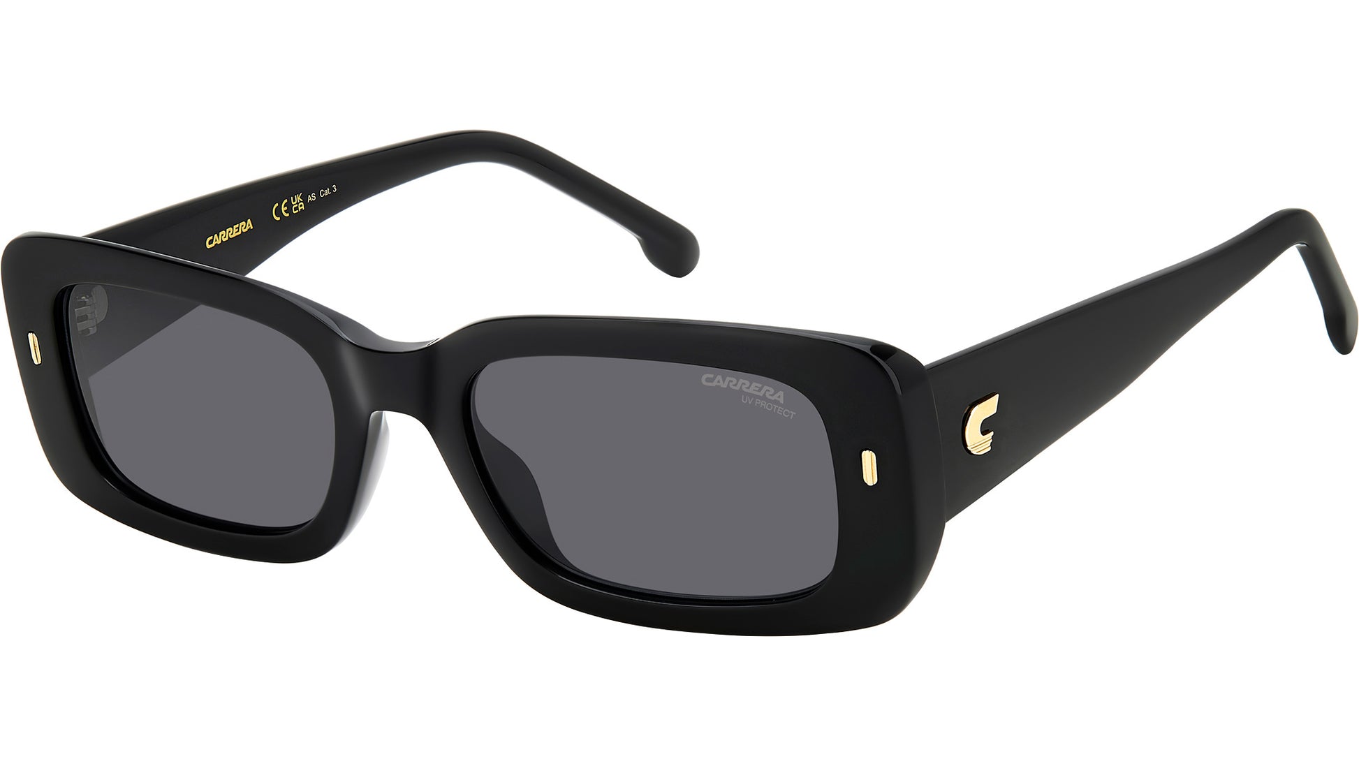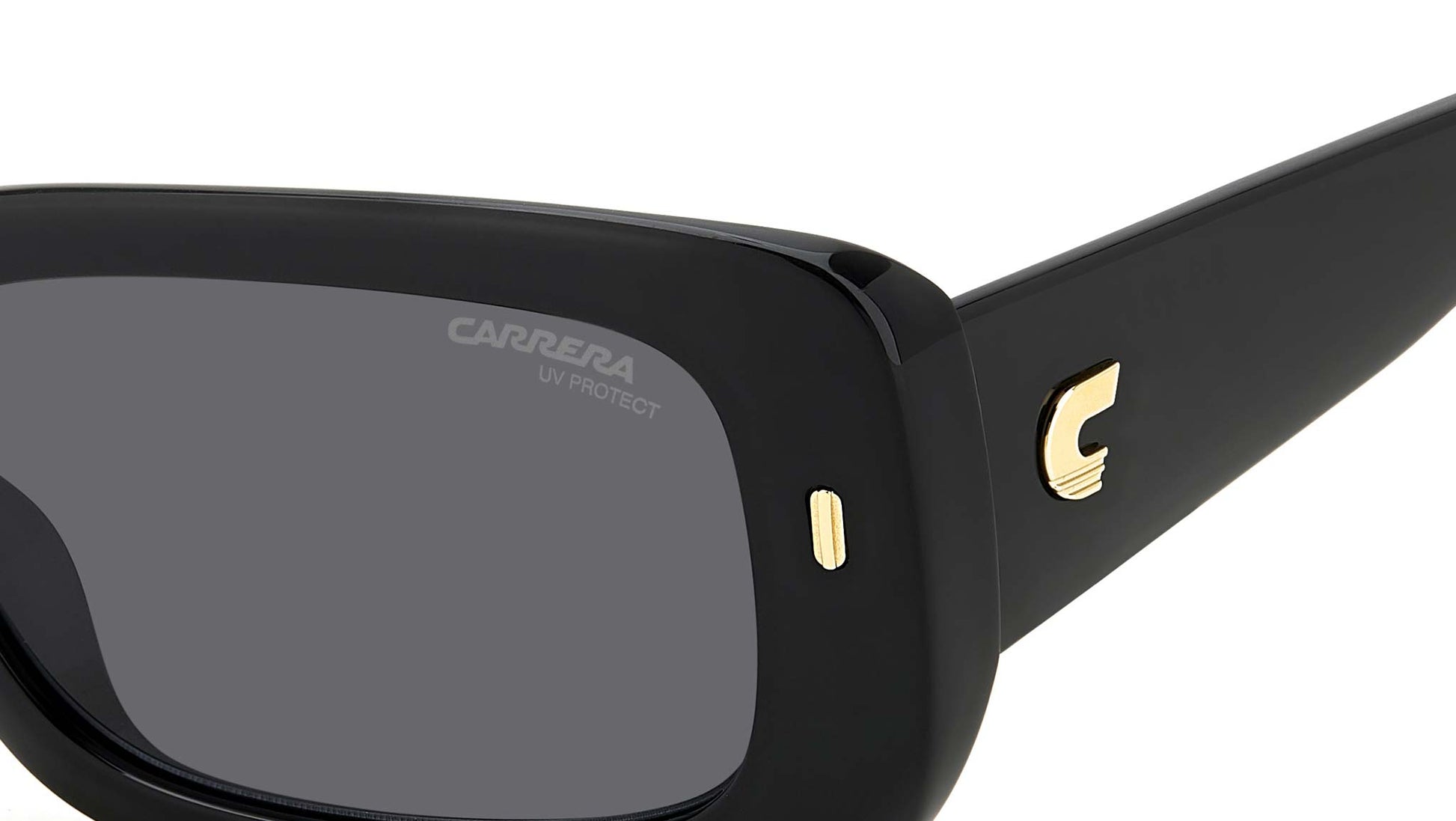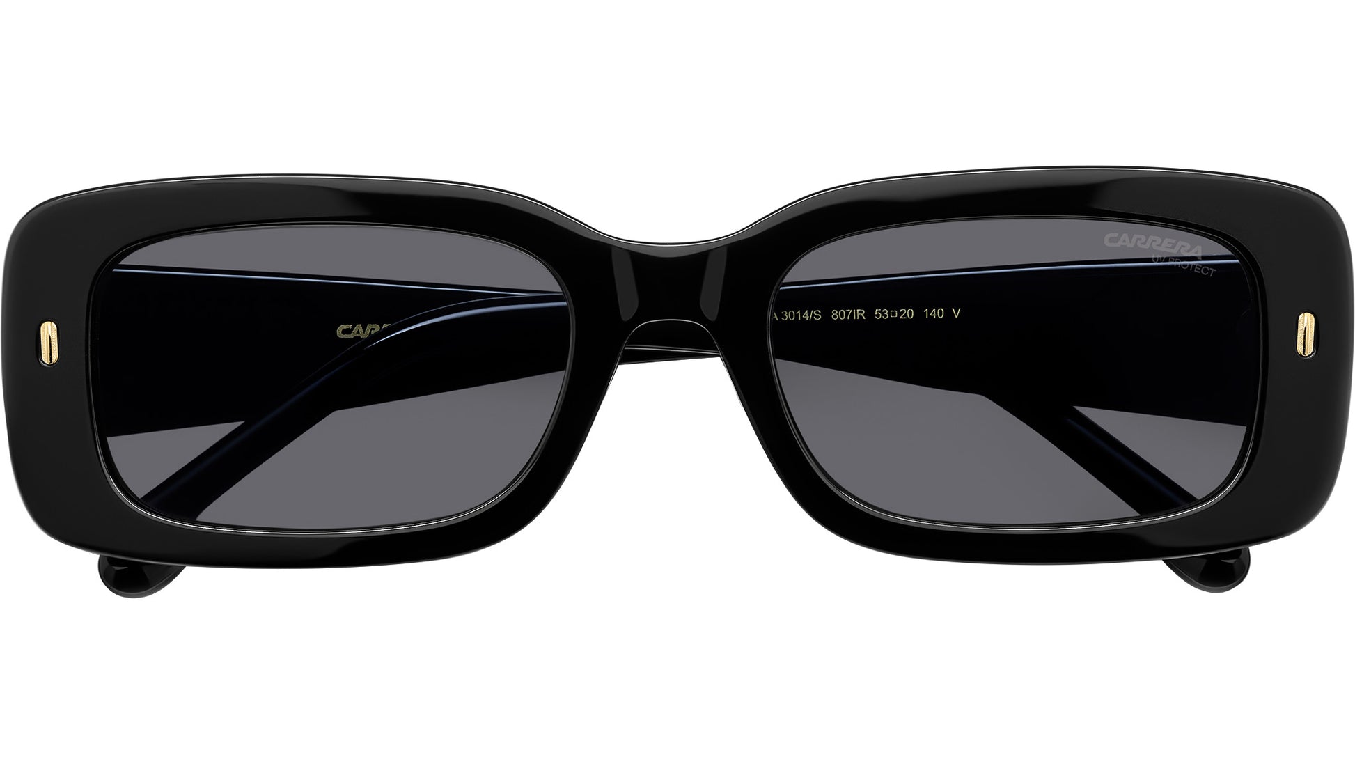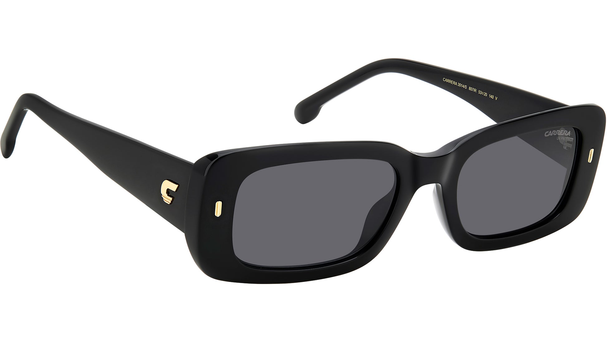 Carrera 3014/S 807 IR sunglasses for women, featuring black rectangular acetate frame and grey lenses. The rectangular shape of these women’s sunglasses by Carrera is sure to get noticed. On that note, the acetate structure features bold outlines, lit up by the elegant rivet on the front and the embossed Carrera ‘C’ on the temples. The frames can be fitted with prescription sun lenses, and the look comes in transparent, multi-layer and colourful Havana versions. Brand line: Flag. Style code: 206324. Color code: 807 IR. Authorized Carrera online reseller. Your glasses will include the original case and accessories and are covered by a 12-month global warranty.