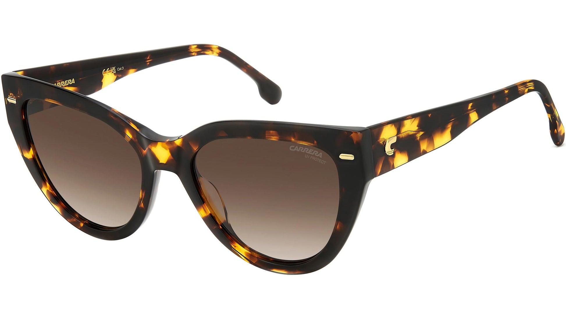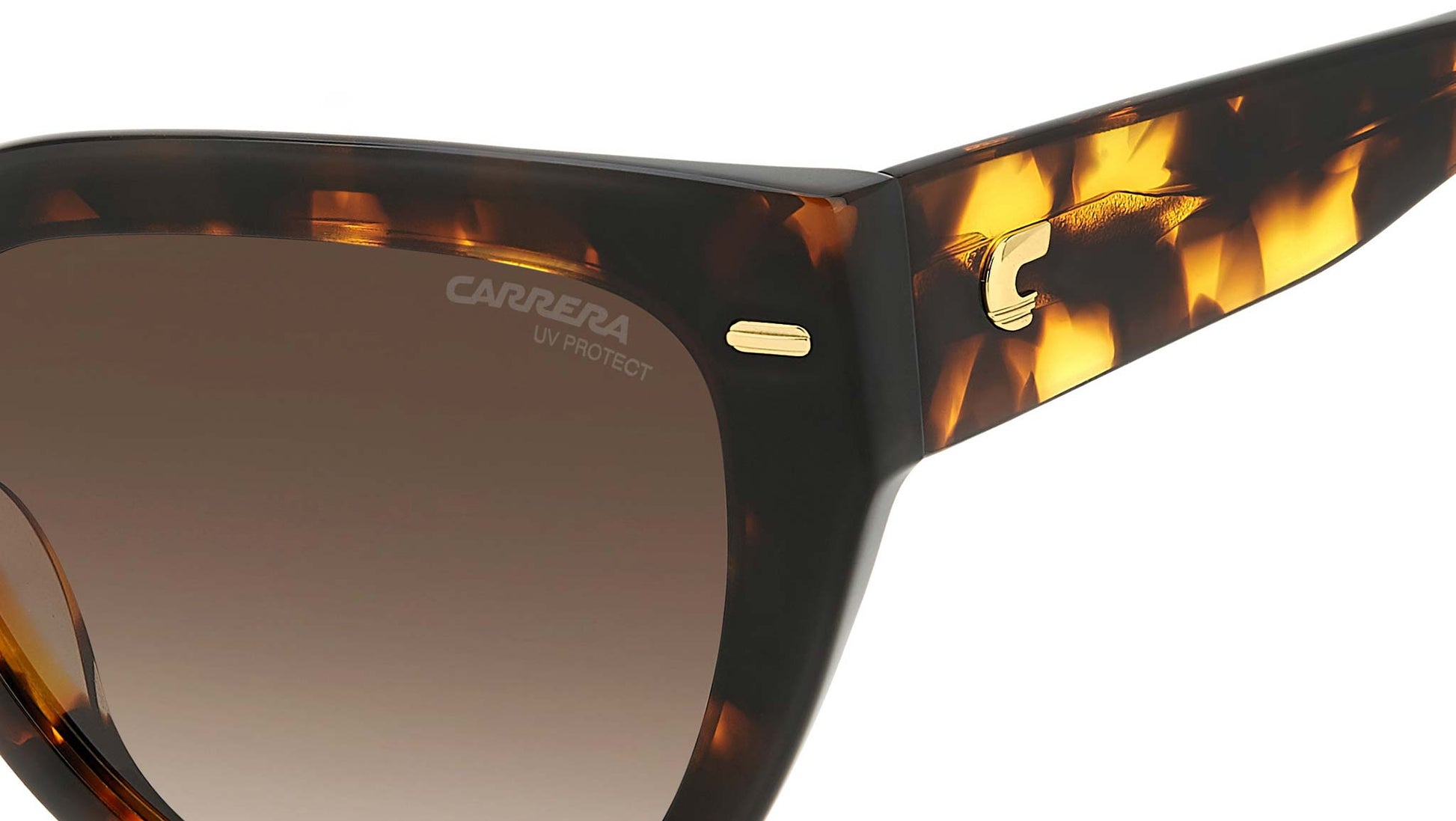 Carrera sunglasses model 3017/S color code 086 HA Havana. Carrera updates the most elegant eyewear shape, the cat eye, with these boldly proportioned sunglasses. Metal details shimmer on the acetate frames like small gems, including the frontal rivets and the iconic ‘C’ in relief on each temple. The gradient sun lenses, which are prescription-friendly, protect the eyes and face.