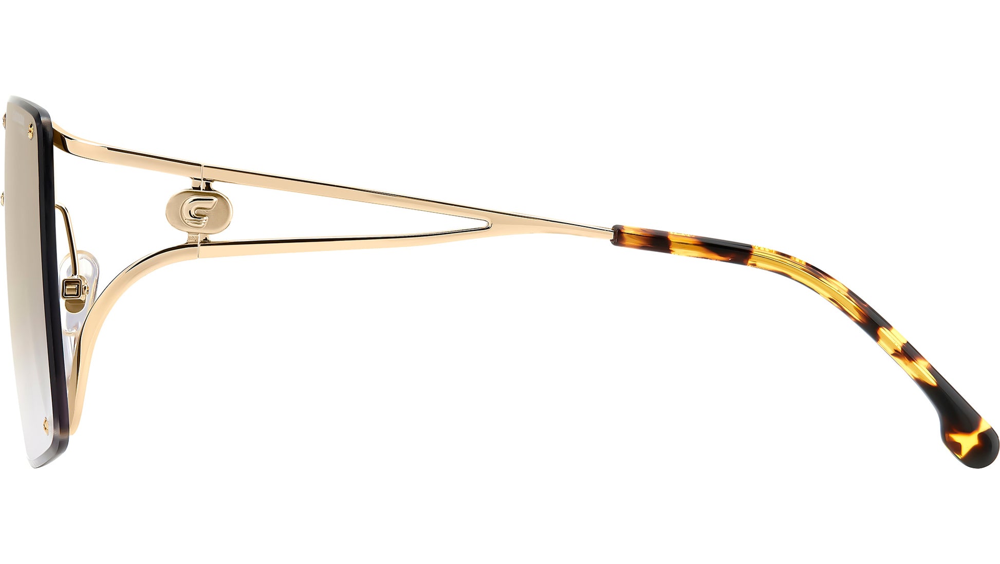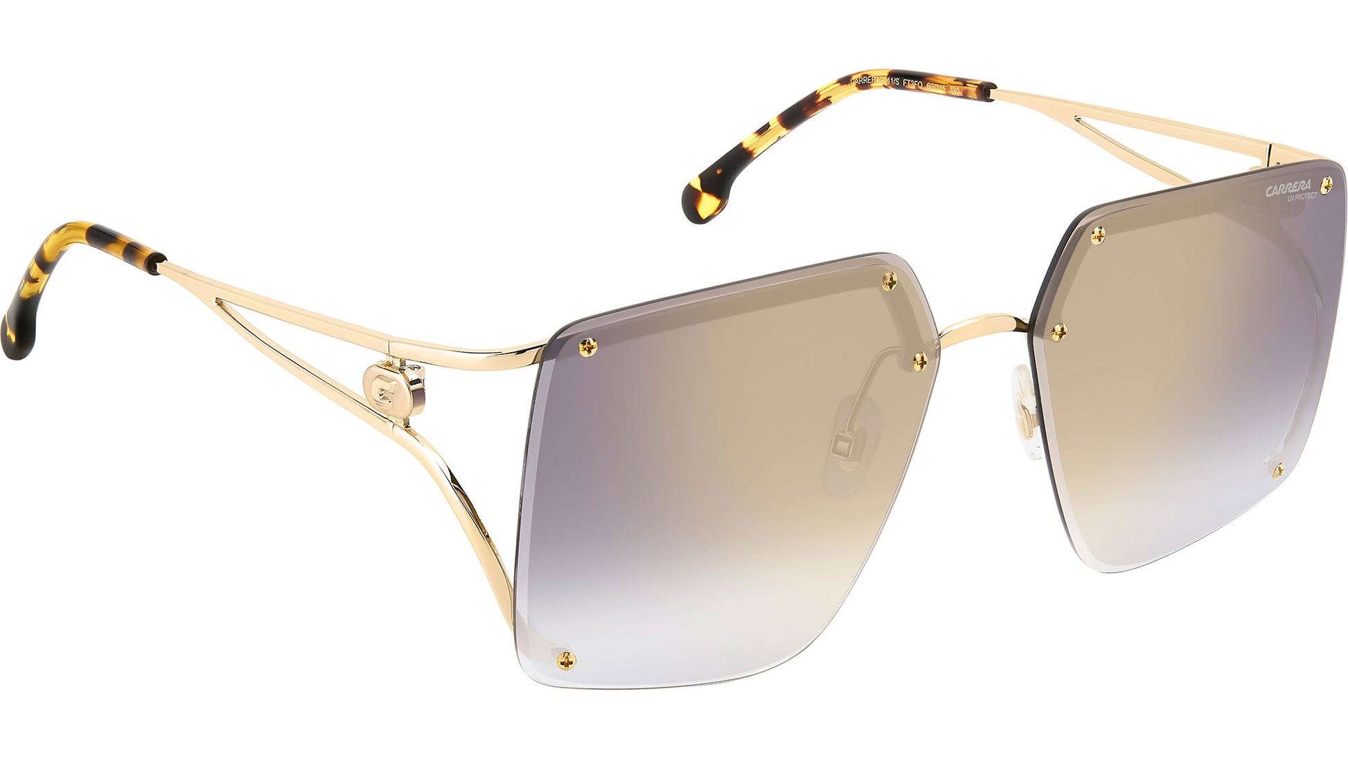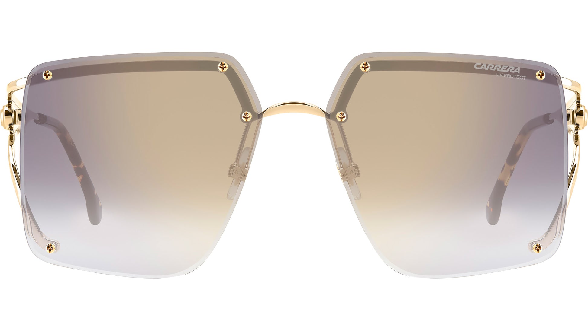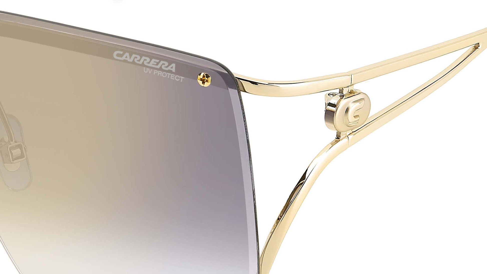 Carrera 3041/S FT3 FQ sunglasses for women, featuring grey gold squared metal frame and grey shaded gold mirror lenses. Carrera connoisseurs will adore these women's sunglasses. The rimless front, with colour-gradient lenses, is undeniably hypnotic, the star of any look. No detail has been left to chance: the screws that connect to the bridge and the temples are functional and decorative. The forked temple design, embellished by a suspended logo with an embossed ‘C’, is unforgettable. Sophisticated hues complete this unmistakably Carrera accessory. Brand line: Flag. Style code: 206829. Color code: FT3 FQ. Authorized Carrera online reseller. Your glasses will include the original case and accessories and are covered by a 12-month global warranty.