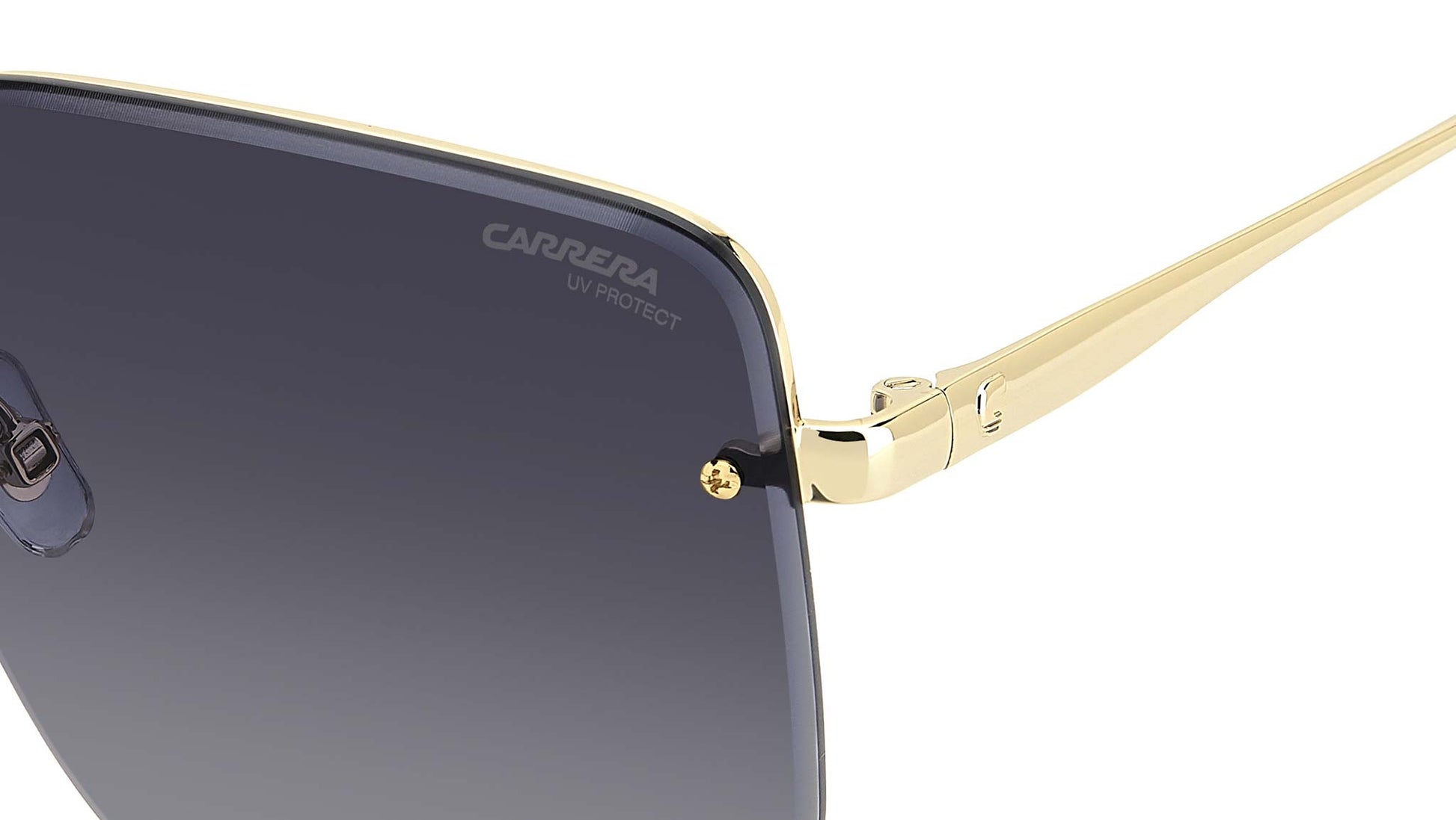 Carrera 3044/S RHL A8 sunglasses for women, featuring gold black rectangular metal frame and brown shaded blue mirror lenses. Minimalist doesn’t have to be ordinary, and these women’s sunglasses by Carrera are proof. The gradient sun lenses are the focus, layered over modern square rims and secured onto the structure by elegant visible screws. Entirely in metal, the slender lines of these glasses make them lightweight, while adjustable nose pads are the hallmarks of stability. A laser-engraved ‘C’ on each temple ensures femininity while staying true to the Carrera DNA. Brand line: Flag. Style code: 207623. Color code: RHL A8. Authorized Carrera online reseller. Your glasses will include the original case and accessories and are covered by a 12-month global warranty.