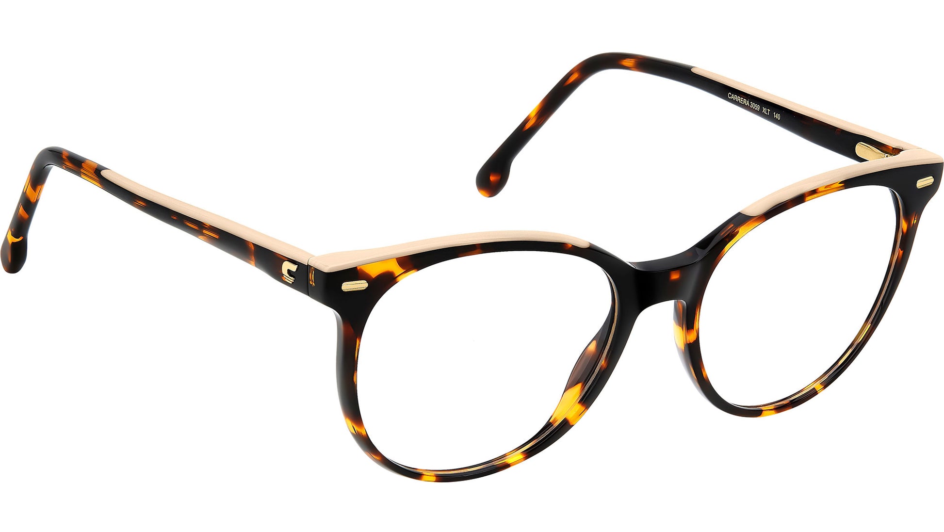 Carrera CARRERA 3059 XLT glasses for women, featuring havana beige rectangular acetate frame and demo lens lenses. With these Pantos glasses for women, Carrera has created a contemporary classic. The acetate structure is embellished by rivets at the front. On the temples, the embossed 'C' is subtle but recognizable, a signature Carrera detail. The colourways are stunning and include transparent versions and those with a contrast inlay along the top. Flex hinges offer an always-comfortable fit. Brand line: Signature. Style code: 109439. Color code: XLT. Authorized Carrera online reseller. Your glasses will include the original case and accessories and are covered by a 12-month global warranty.