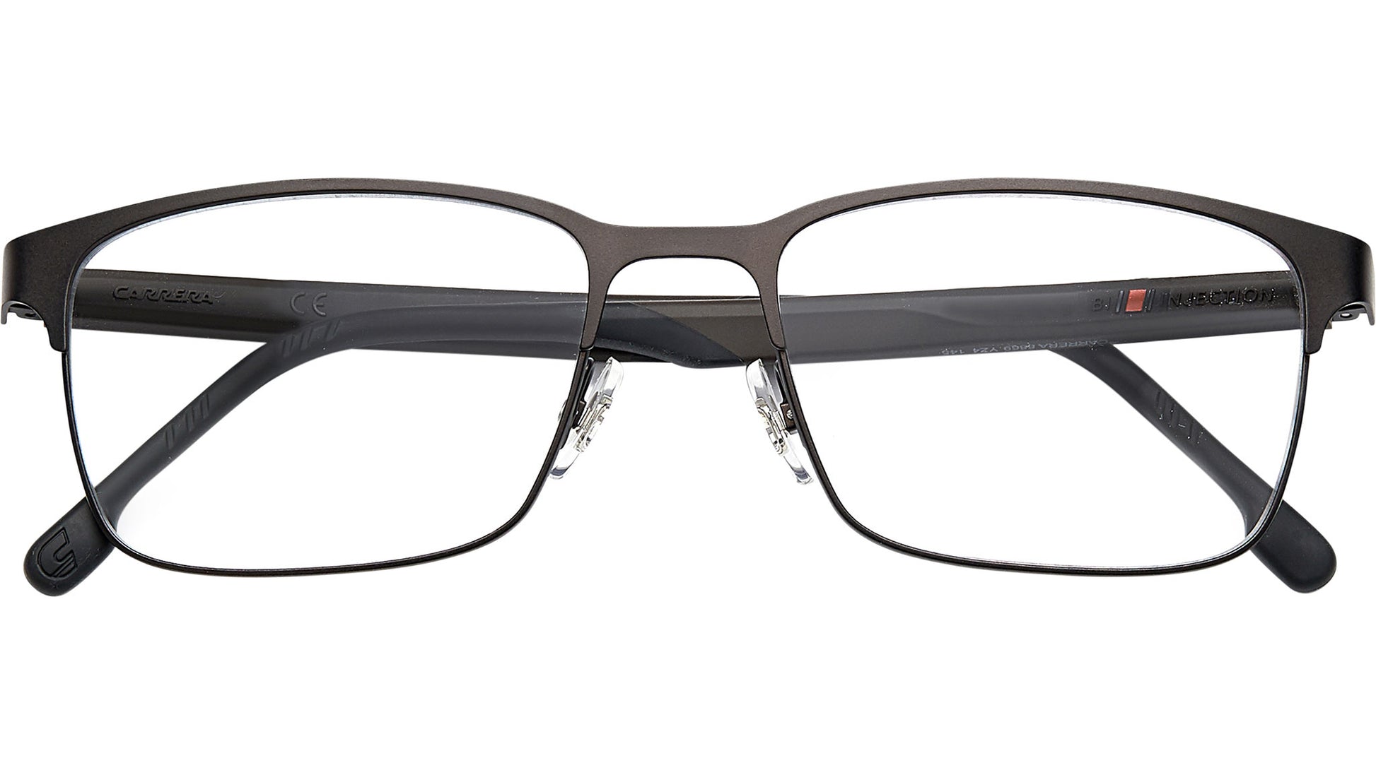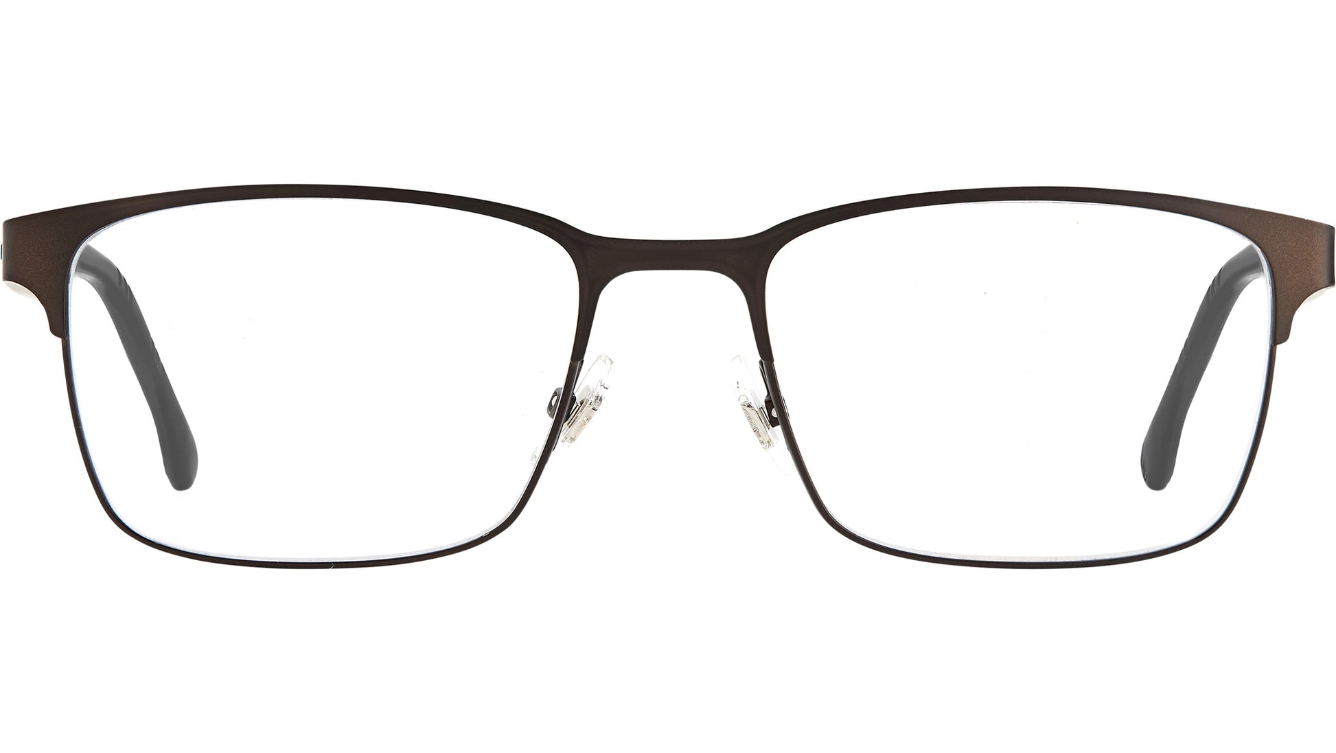 Carrera optical frame model 8869 color code YZ4 Matte Brown. A seamless combination of sleek metal and lightly textured polyamide - these prescription glasses have been expertly crafted using bi-injection molding technology. They feature a classic rectangular front and tapered arms equipped with non-slip rubber grips for comfort. A set of flex hinges ensures a precise fit.