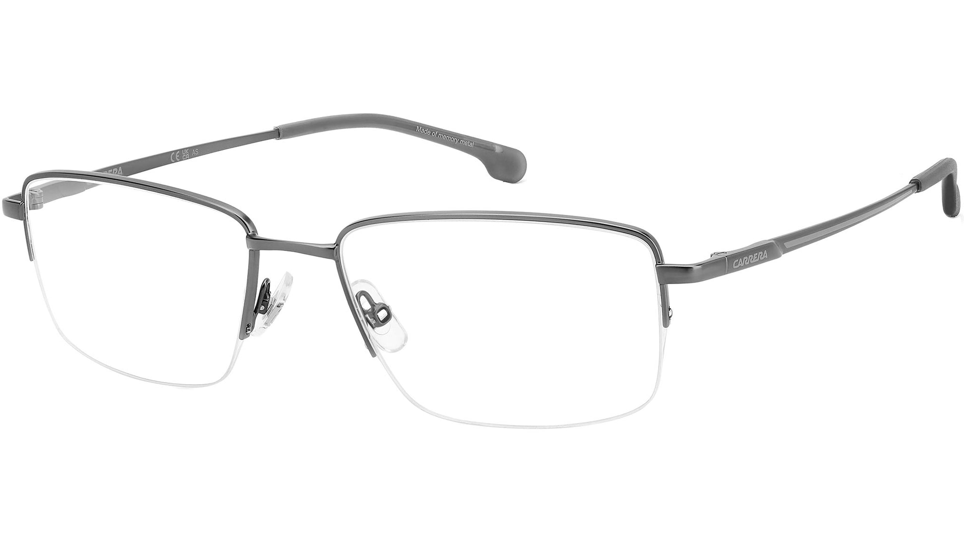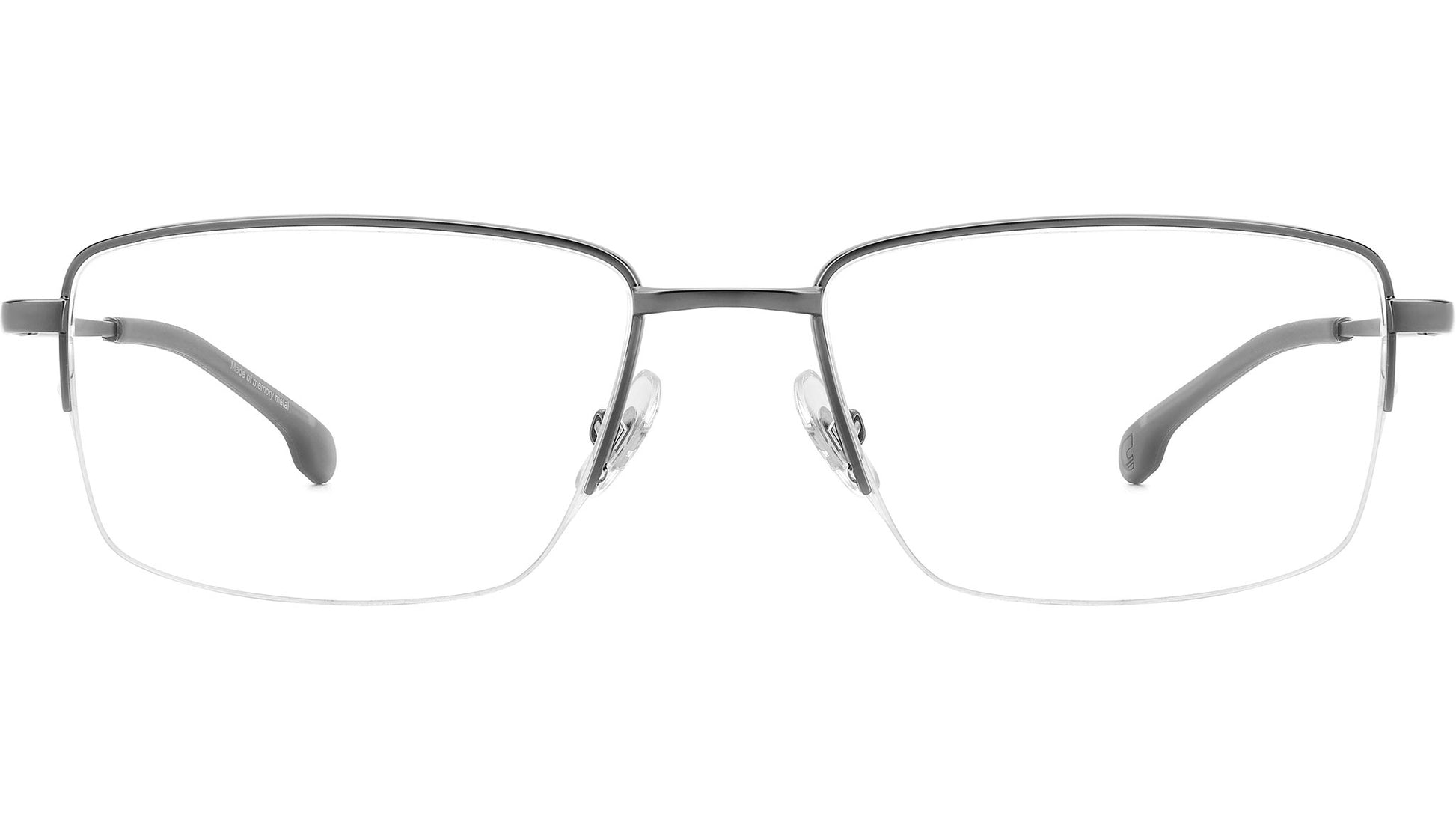 Carrera optical frame model 8895 color code R80 Matte Dark Ruthenium. With these glasses, Carrera offers unbeatable technical qualities. The temples and the nose bridge are made of Memory Metal, a premium material that ensures maximum flexibility and long-lasting durability. The practicality of this style is further enhanced by the shape of the half-rim front, the fit of which is optimised by adjustable nose pads. A Carrera flag, printed on the temples, expresses the identity of the brand.