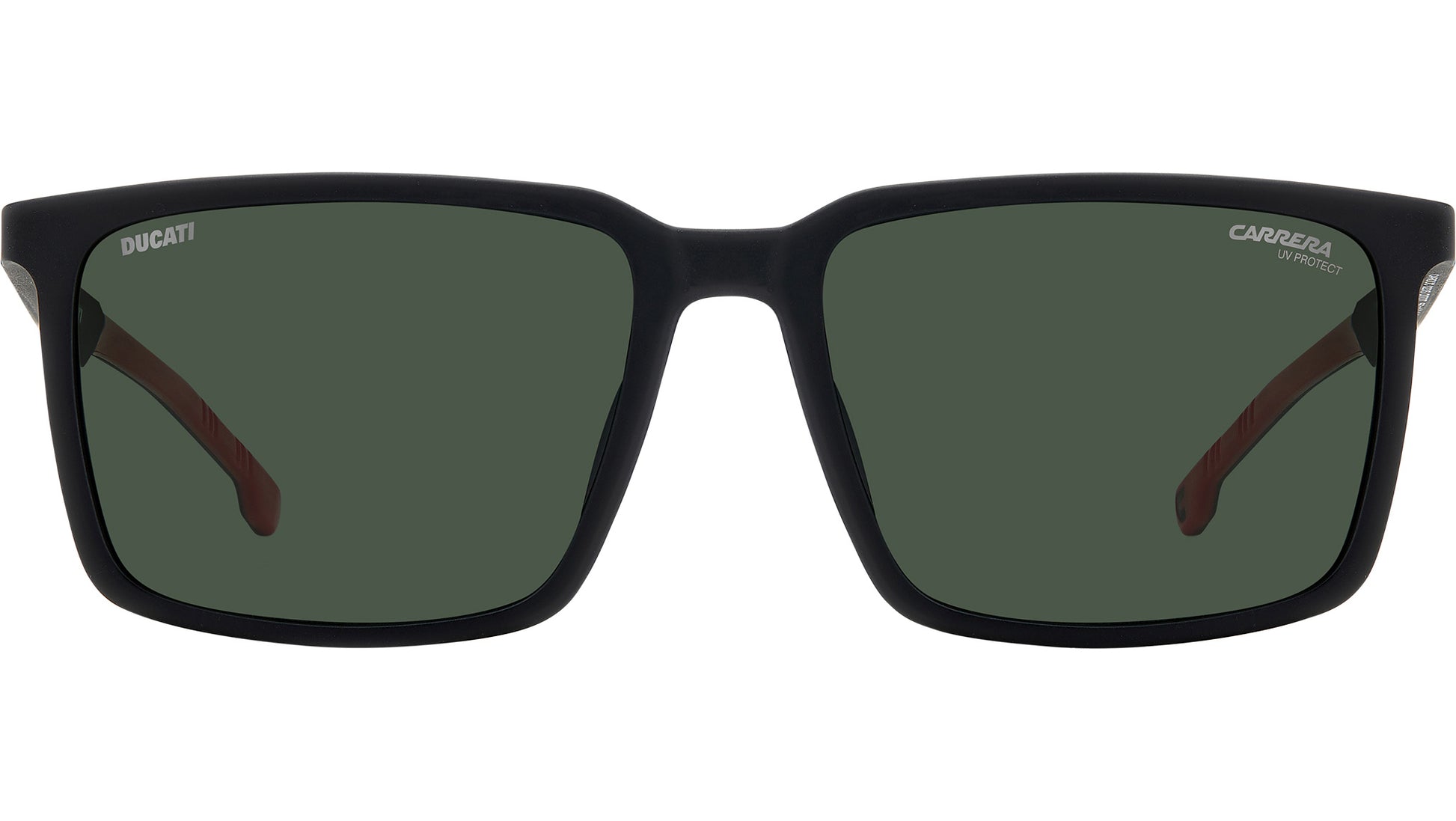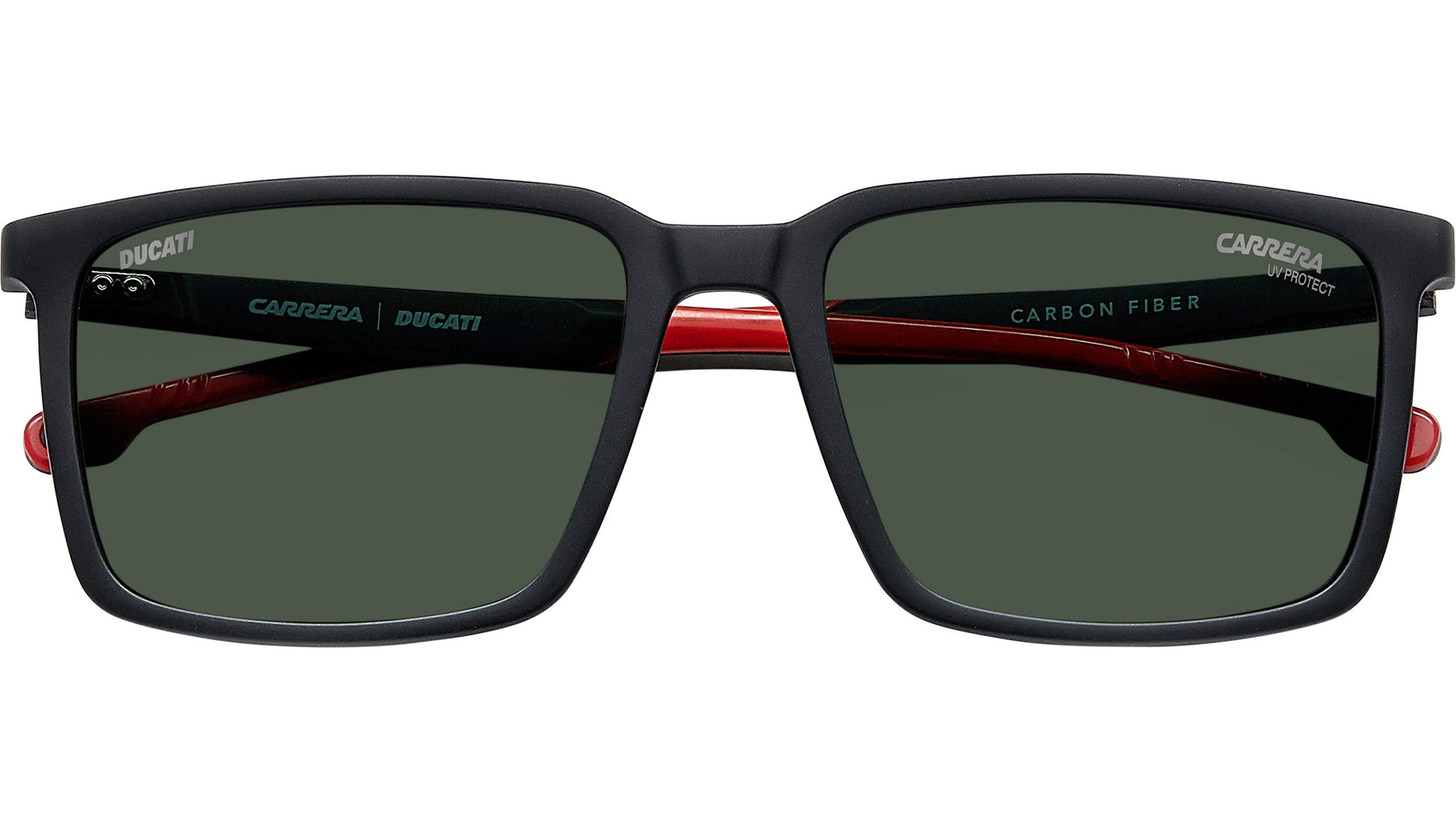 Carrera Ducati sunglasses model CarDuc 023/S color code OIT QT Black Red. Best-in-class on the racetrack and even while relaxing, these sunglasses combine materials and details that reflect the worlds of Carrera and Ducati. Connoisseurs will recognise the innovative new shape of the temples (a tribute to the iconic Panigale), and the use of high-performance carbon fibre gives them impeccable technical characteristics. The square frames can hold prescription sun lenses and are offered in mirrored and ultrapolar versions.