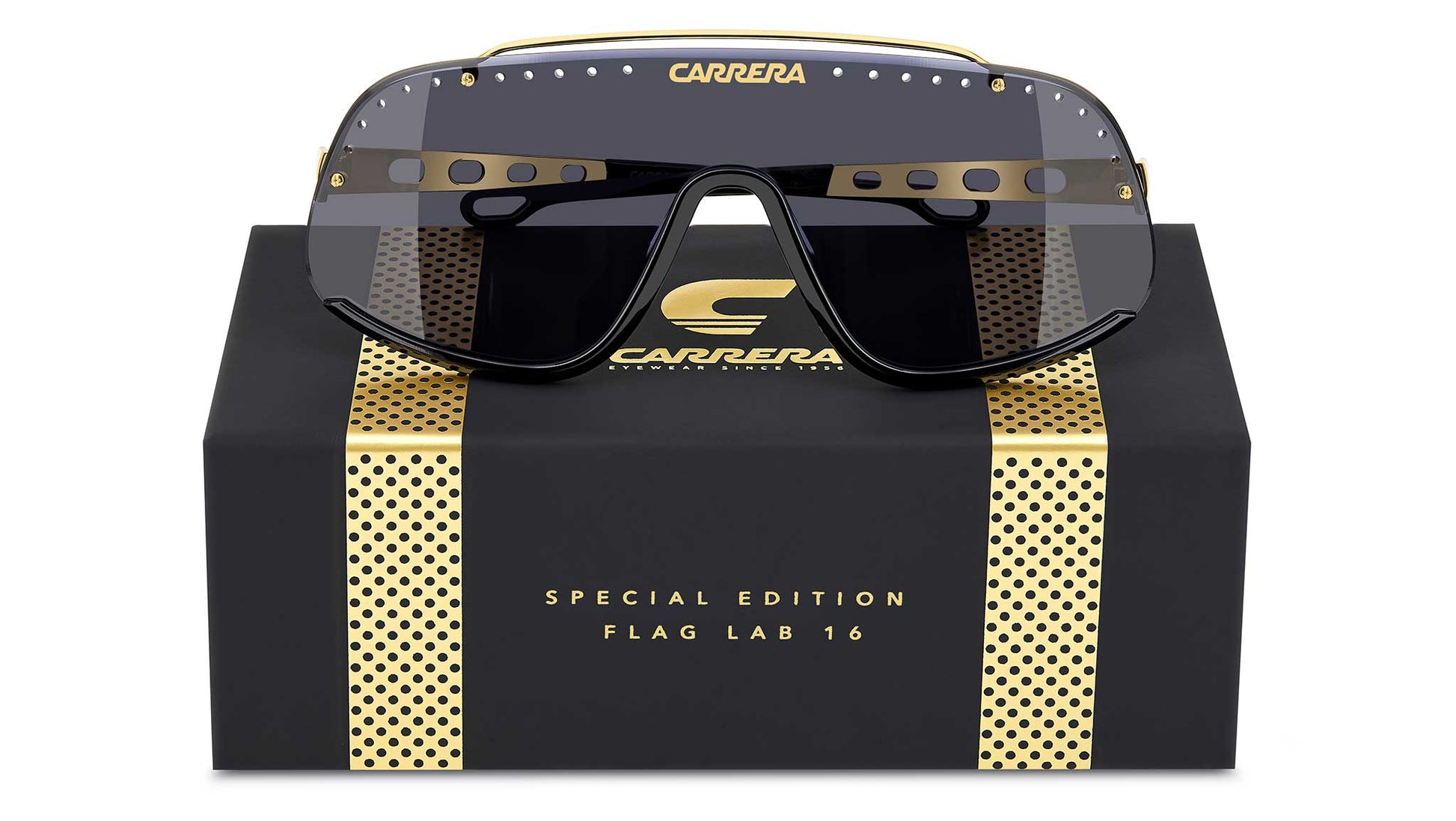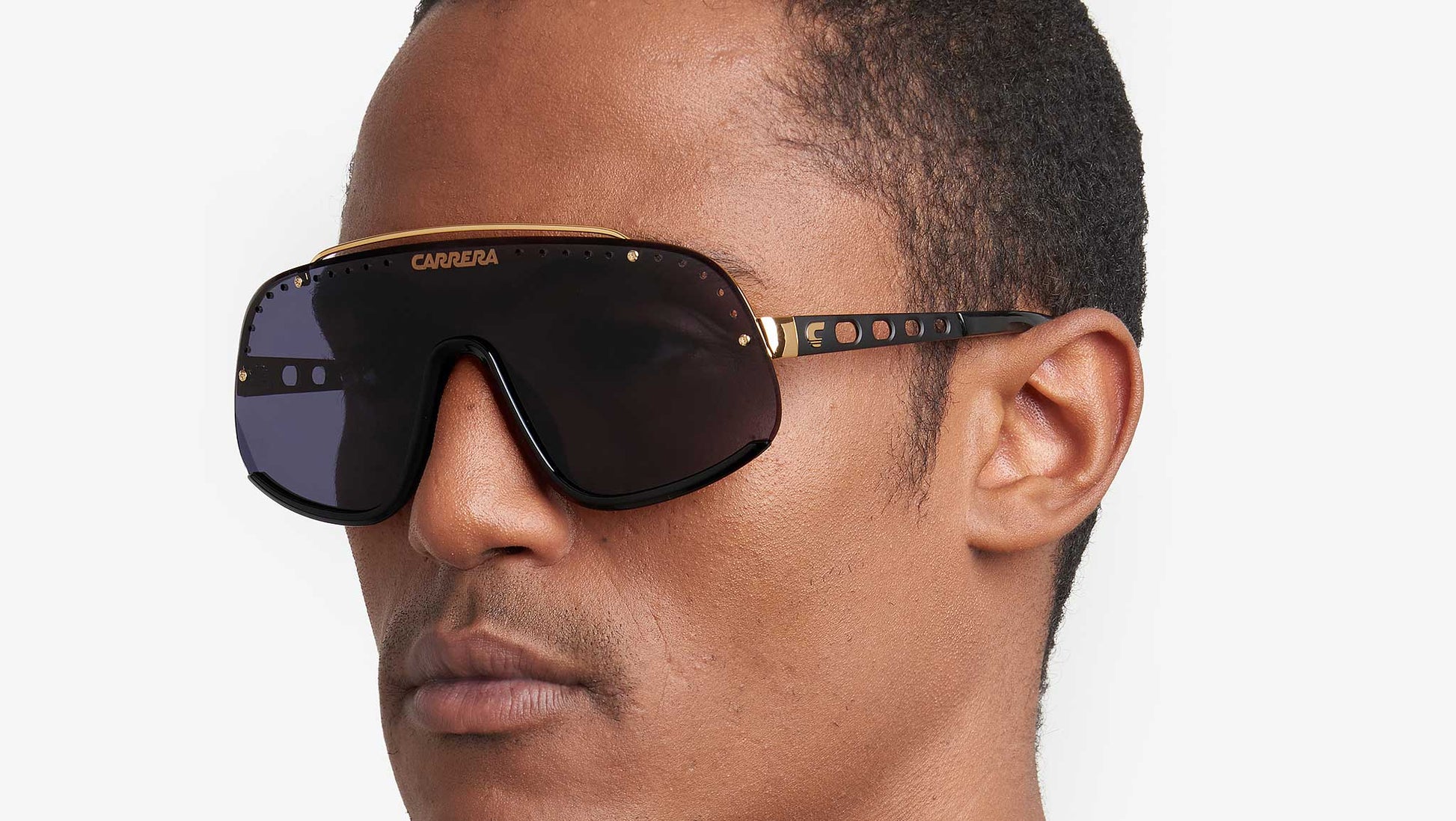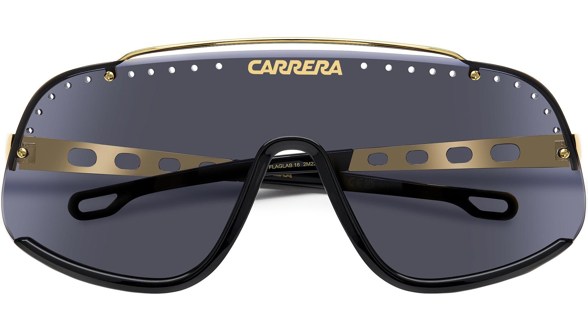 Carrera sunglasses model Flaglab 16 color code 2M2 2K Black Gold. The racing spirit of Carrera is expressed in these unisex sunglasses. The shield front is topped by a slender metal top bar, completed by decorative screws and round venting. The metal temples also feature round openings, echoing in the design of the steering wheels of the classic cars that once raced in the Carrera Panamericana. Some versions have mirrored lenses, including an orange variant for a vintage look. This collector's item comes with its own special packaging.