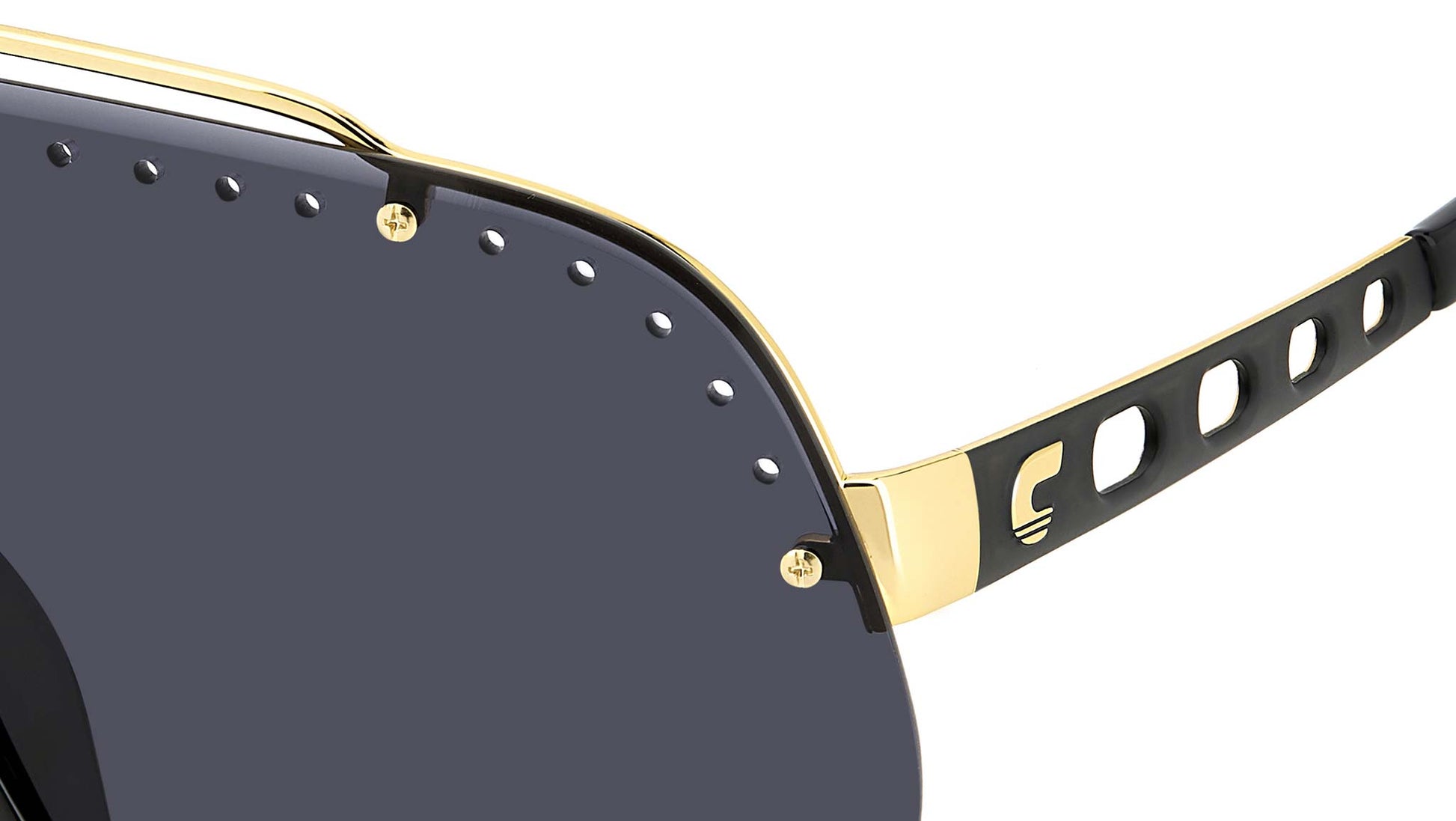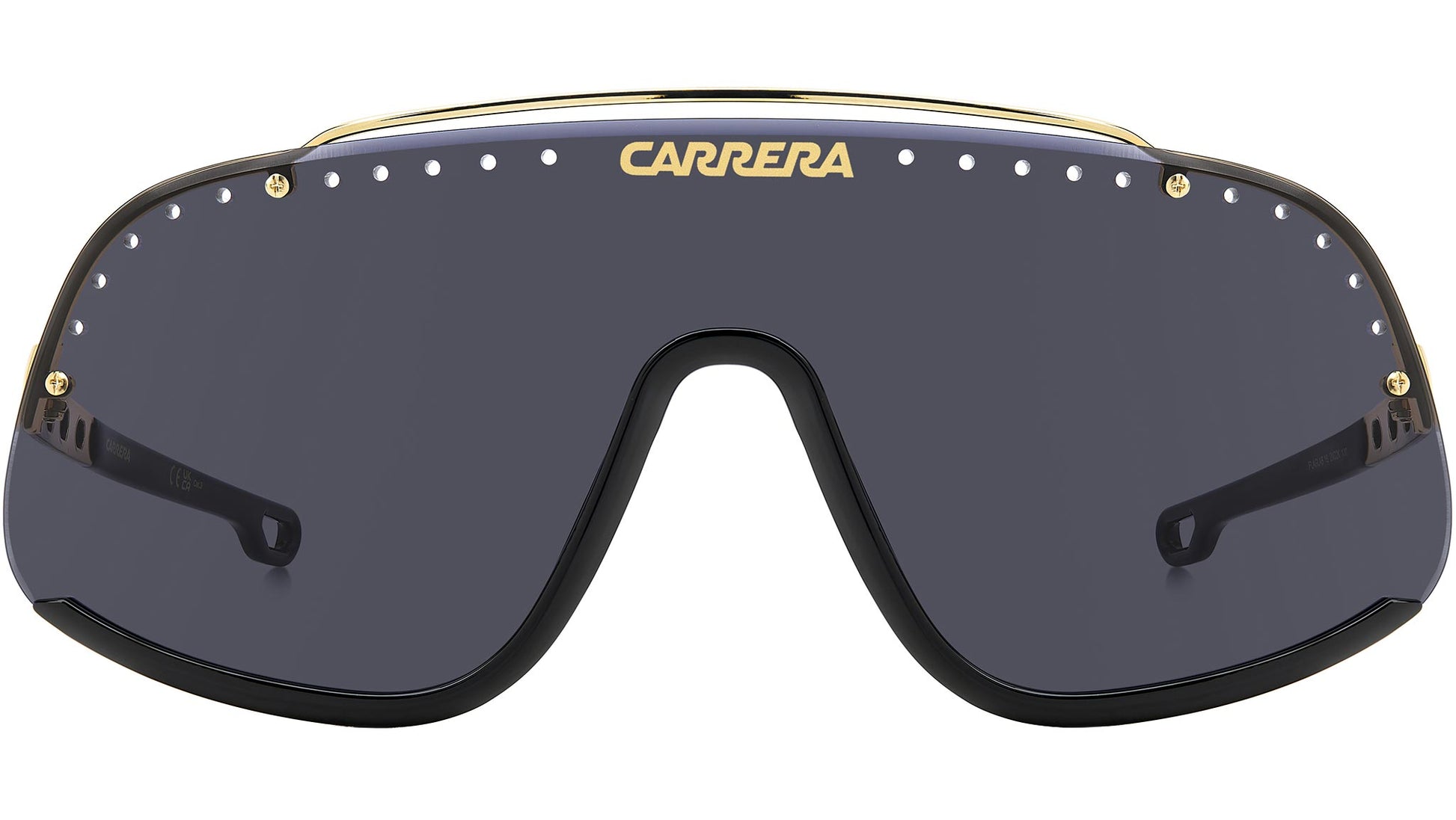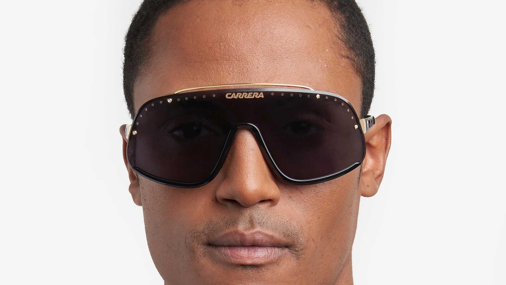 Carrera sunglasses model Flaglab 16 color code 2M2 2K Black Gold. The racing spirit of Carrera is expressed in these unisex sunglasses. The shield front is topped by a slender metal top bar, completed by decorative screws and round venting. The metal temples also feature round openings, echoing in the design of the steering wheels of the classic cars that once raced in the Carrera Panamericana. Some versions have mirrored lenses, including an orange variant for a vintage look. This collector's item comes with its own special packaging.