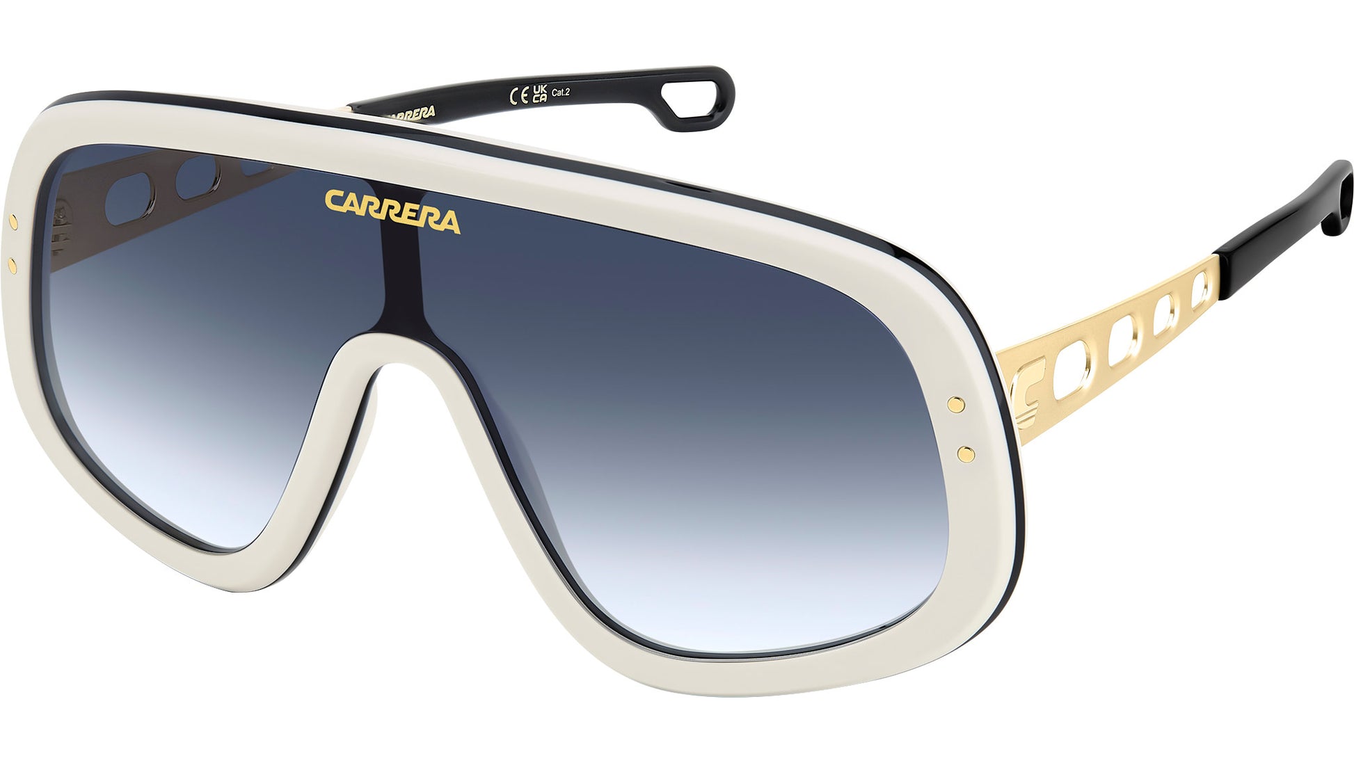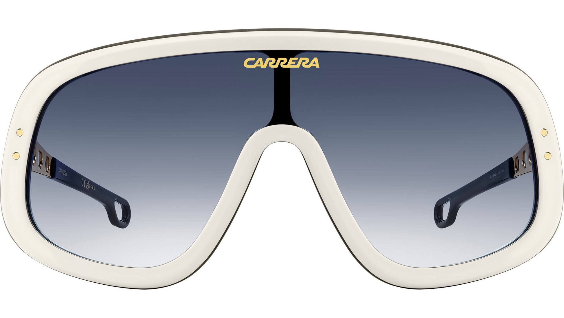 Carrera FLAGLAB 17 B4E 08 sunglasses for men, featuring white gold shield acetate frame and dk blue shaded lenses. These Carrera sunglasses bring a sporty attitude to fashion. The shield front is profiled by acetate, printed with a logo on the lens. The temples are a true gem: their round vents echo the design of the steering wheels on the classic cars which raced in the Carrera Panamericana. Versions with yellow or orange lenses give rise to a truly evocative look. This collector's item comes with its own special packaging. Brand line: Flag. Style code: 207556. Color code: B4E 08. Authorized Carrera online reseller. Your glasses will include the original case and accessories and are covered by a 12-month global warranty.
