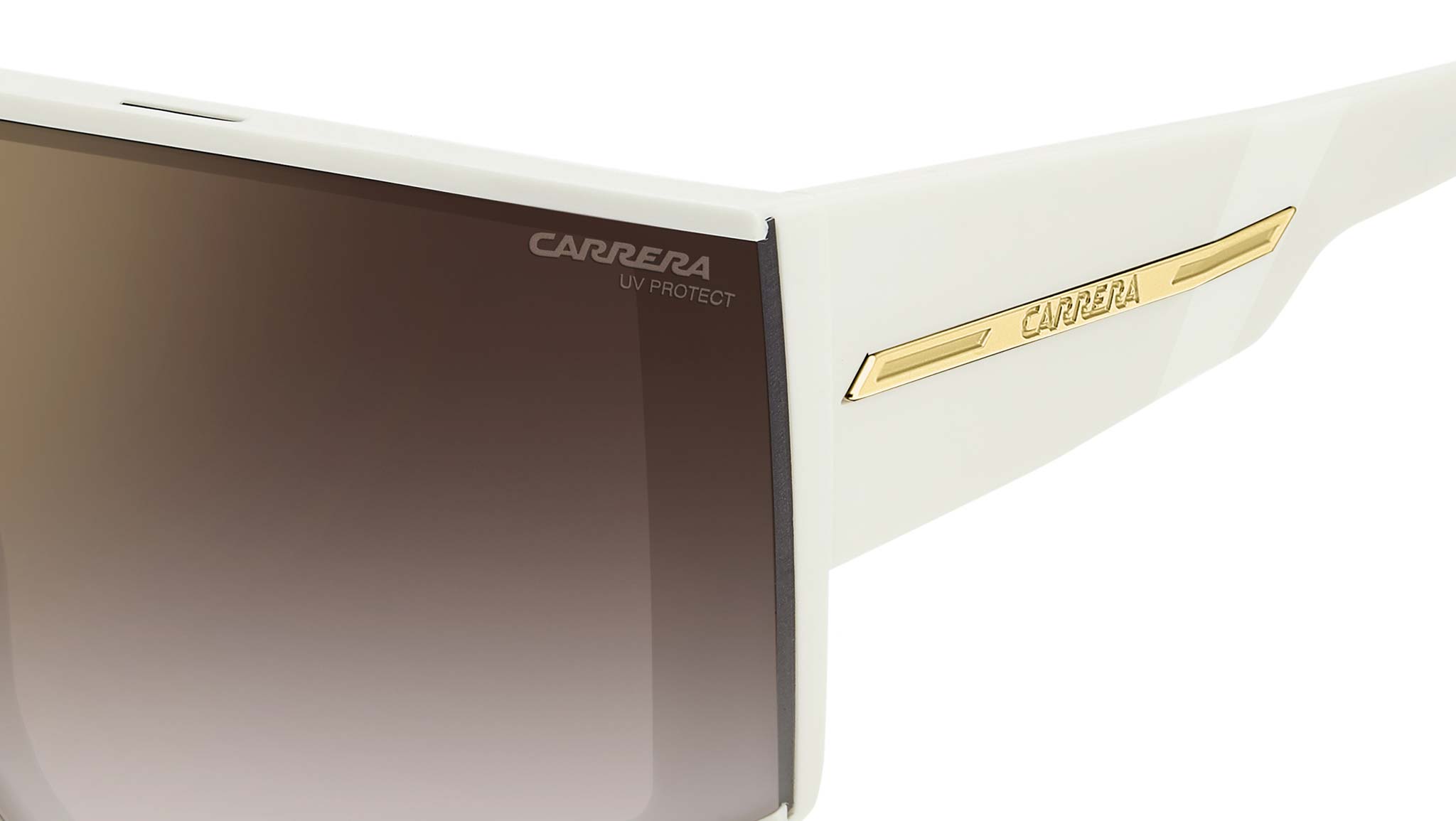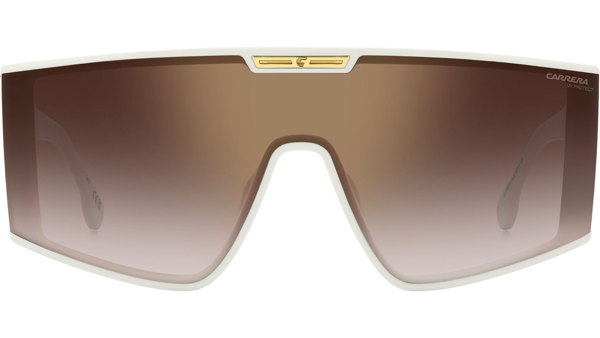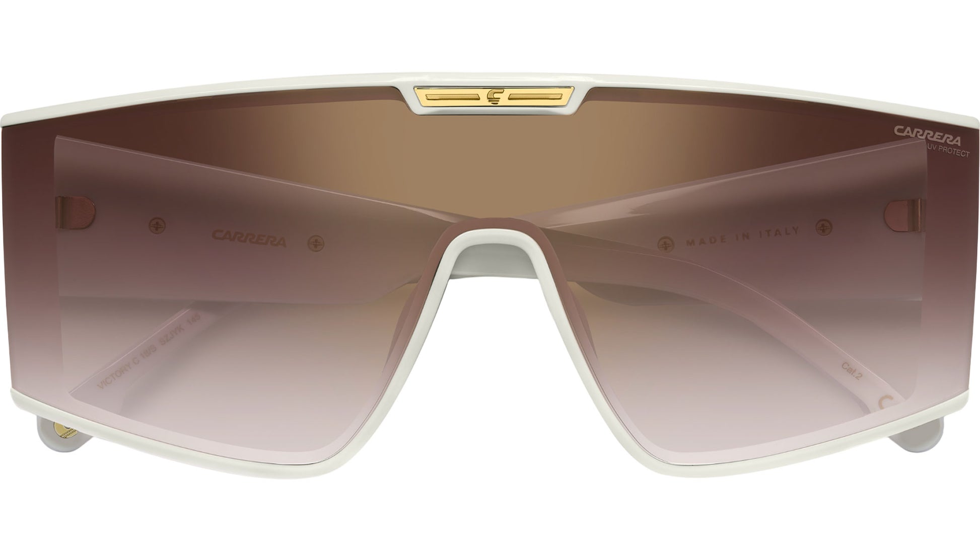 Carrera VICTORY C 18/S SZJ YK sunglasses for women, featuring ivory shield eco polyamide frame and gold mirror on burgundy shaded lenses. These Carrera shield sunglasses are made to stand out. The single-lens front is striking, especially in the mirrored version. A metal plaque with the brand’s C logo sits at the centre top, repeated on the oversized temples that match Carrera’s bold personality. Made in Italy, they come in different colours, including a transparent option. Brand line: Flag. Style code: 208324. Color code: SZJ YK. Authorized Carrera online reseller. Your glasses will include the original case and accessories and are covered by a 12-month global warranty.