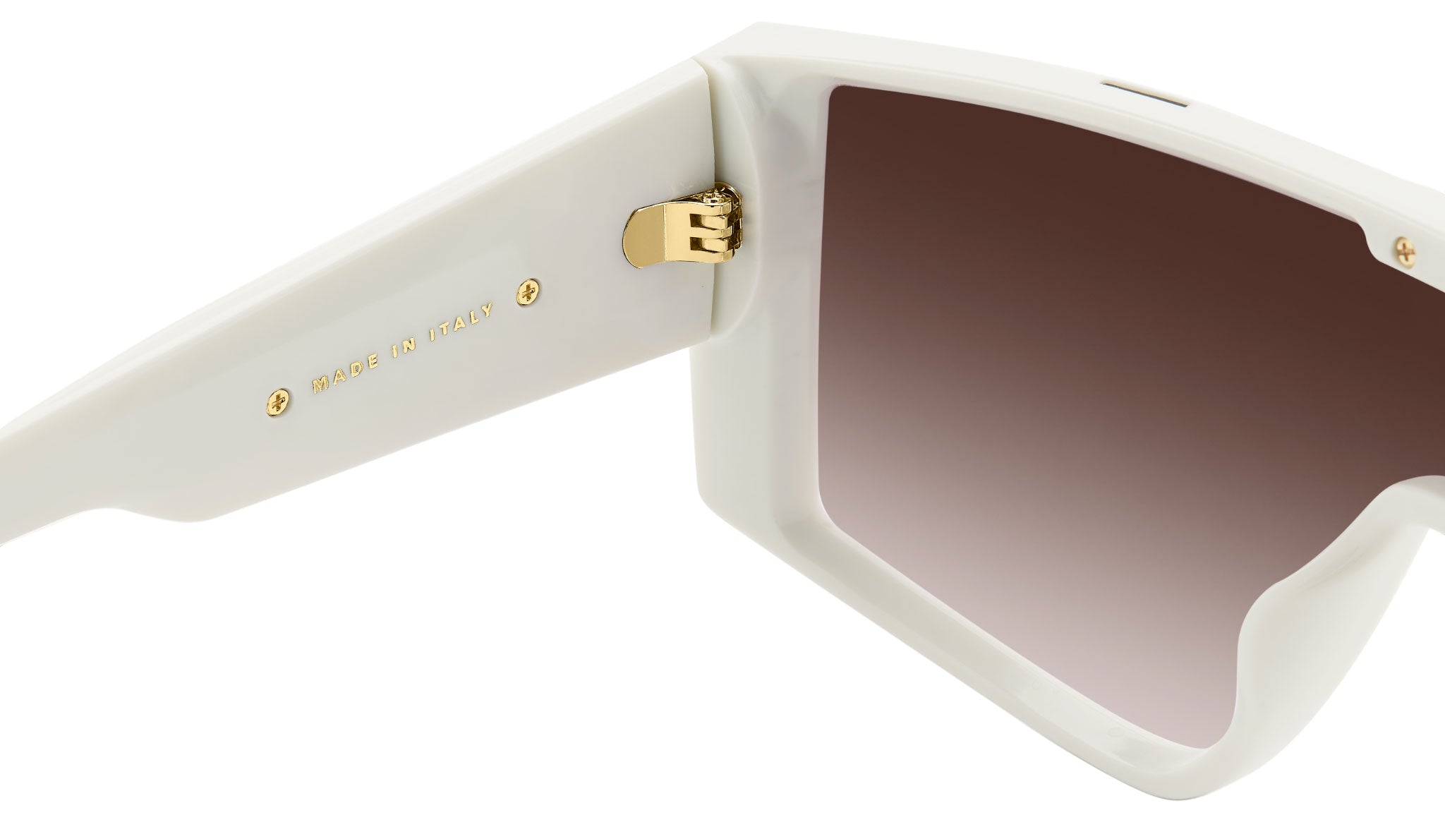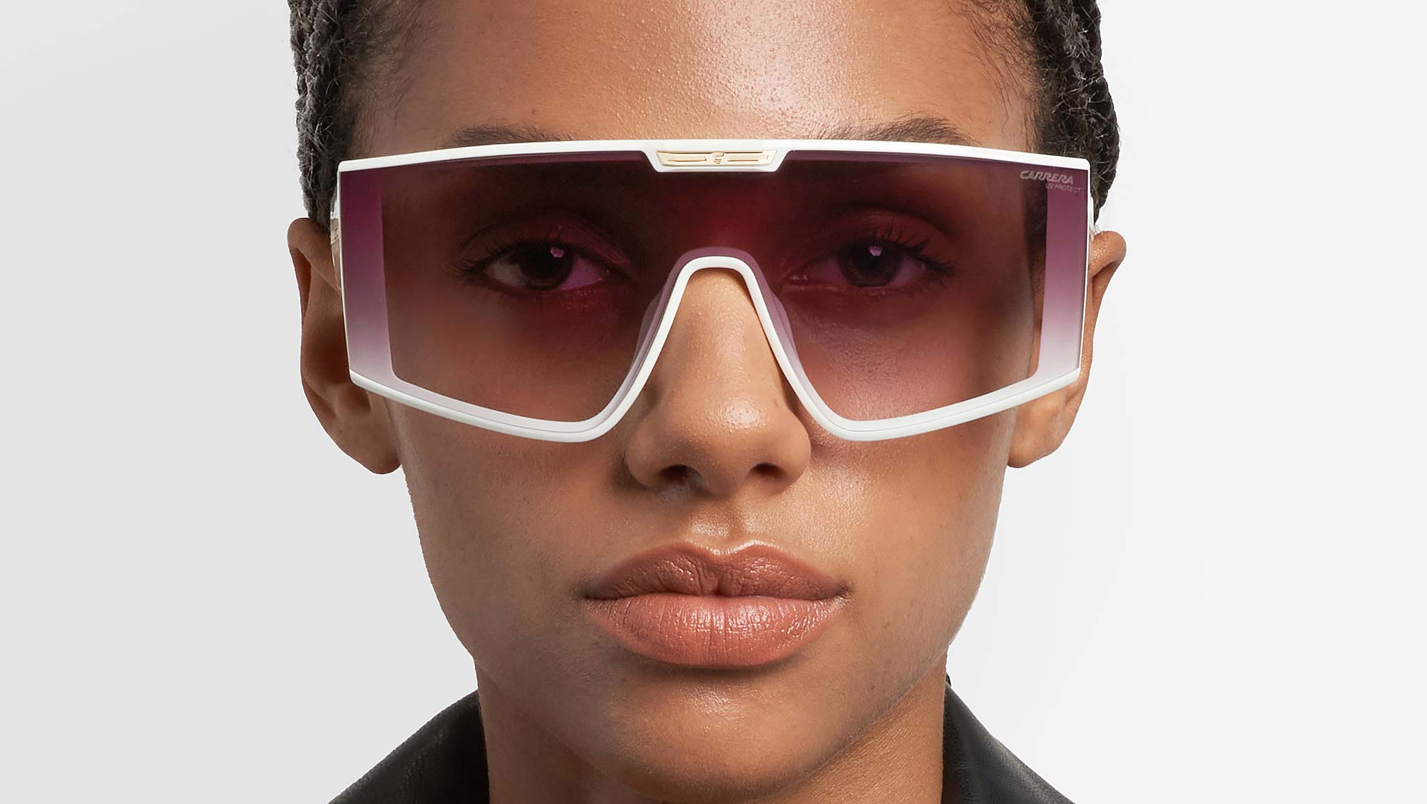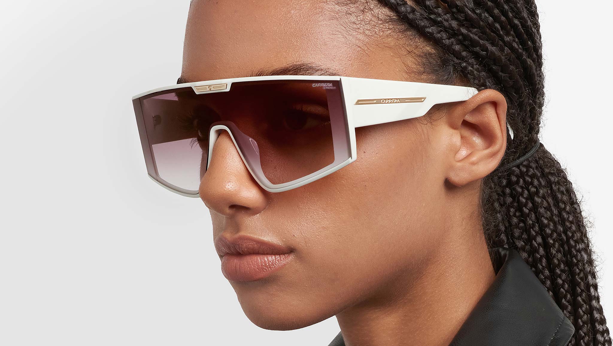 Carrera VICTORY C 18/S SZJ YK sunglasses for women, featuring ivory shield eco polyamide frame and gold mirror on burgundy shaded lenses. These Carrera shield sunglasses are made to stand out. The single-lens front is striking, especially in the mirrored version. A metal plaque with the brand’s C logo sits at the centre top, repeated on the oversized temples that match Carrera’s bold personality. Made in Italy, they come in different colours, including a transparent option. Brand line: Flag. Style code: 208324. Color code: SZJ YK. Authorized Carrera online reseller. Your glasses will include the original case and accessories and are covered by a 12-month global warranty.