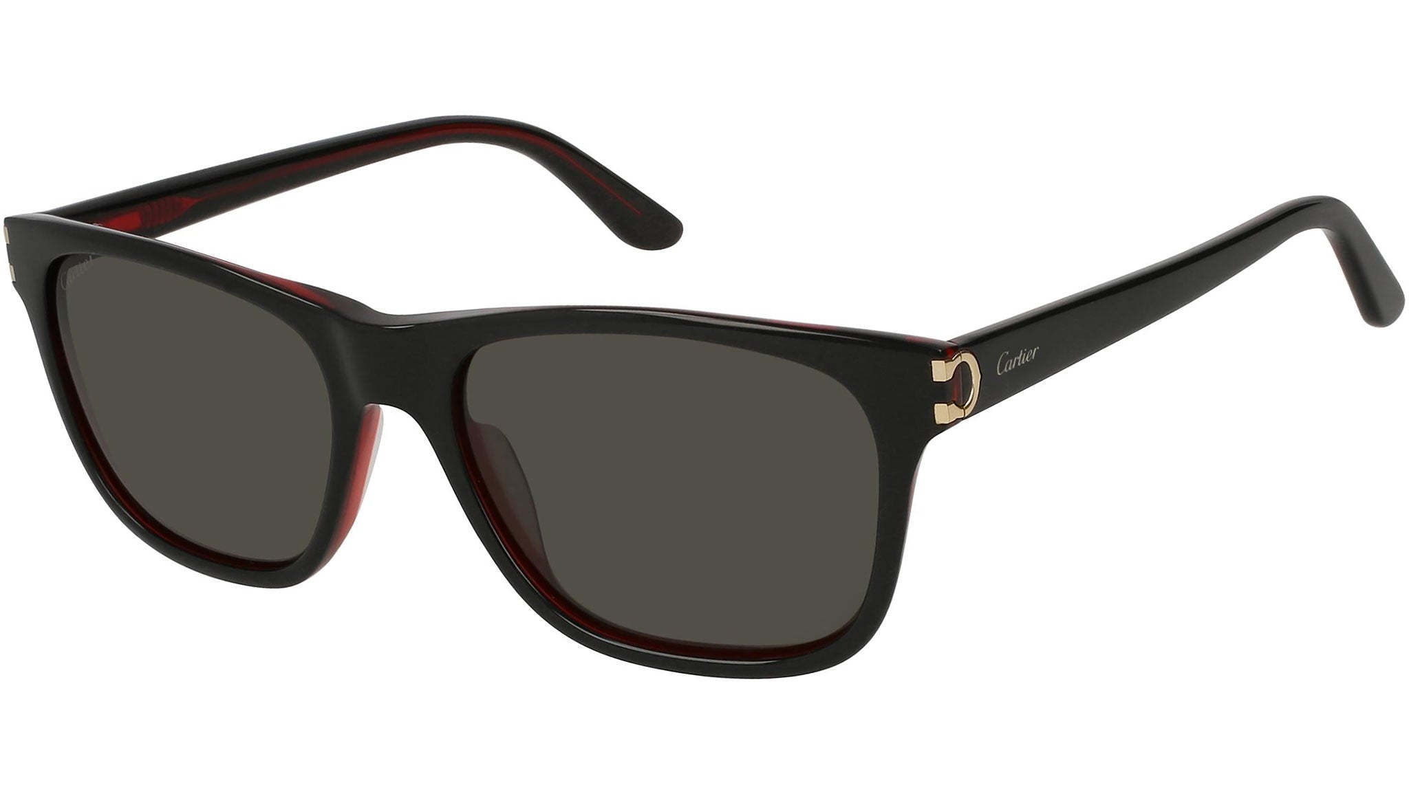 Cartier CT0001S 001 sunglasses with shiny bilayer black / red frame and solid grey + azure lens.