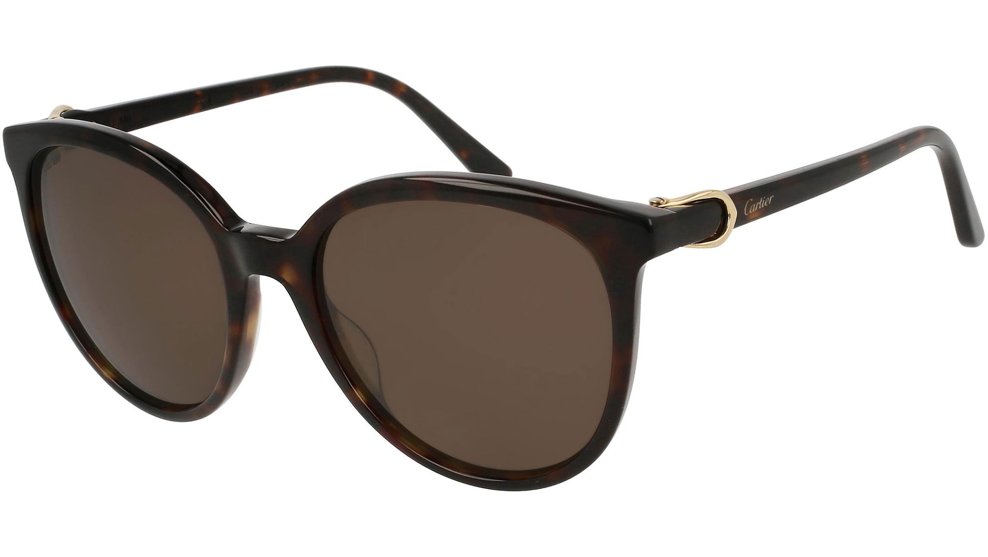 Cartier CT0003S 002 sunglasses with shiny dark havana frame and solid brown + azure lens.