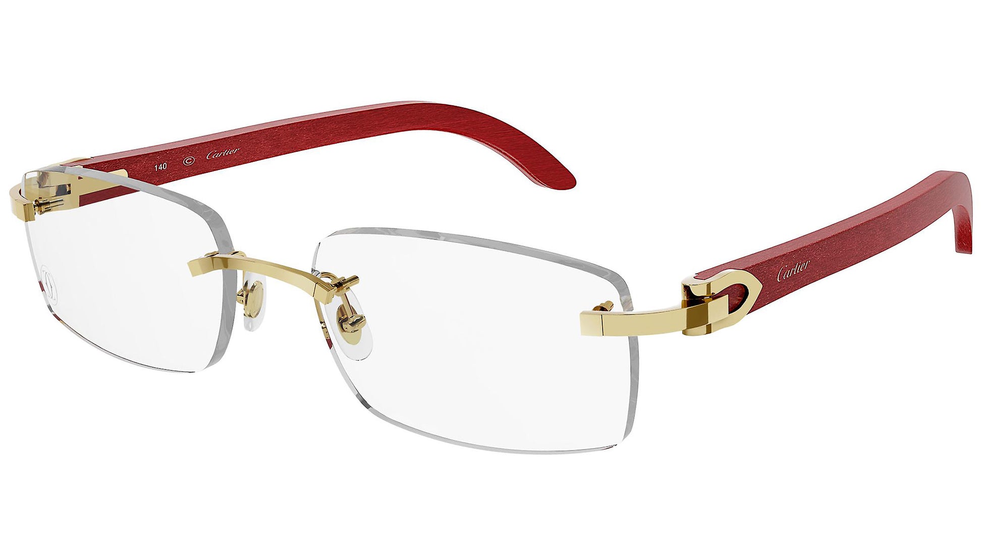 Cartier Exception optical collection model 0052O 006 featuring smooth golden finish frame and red temple.