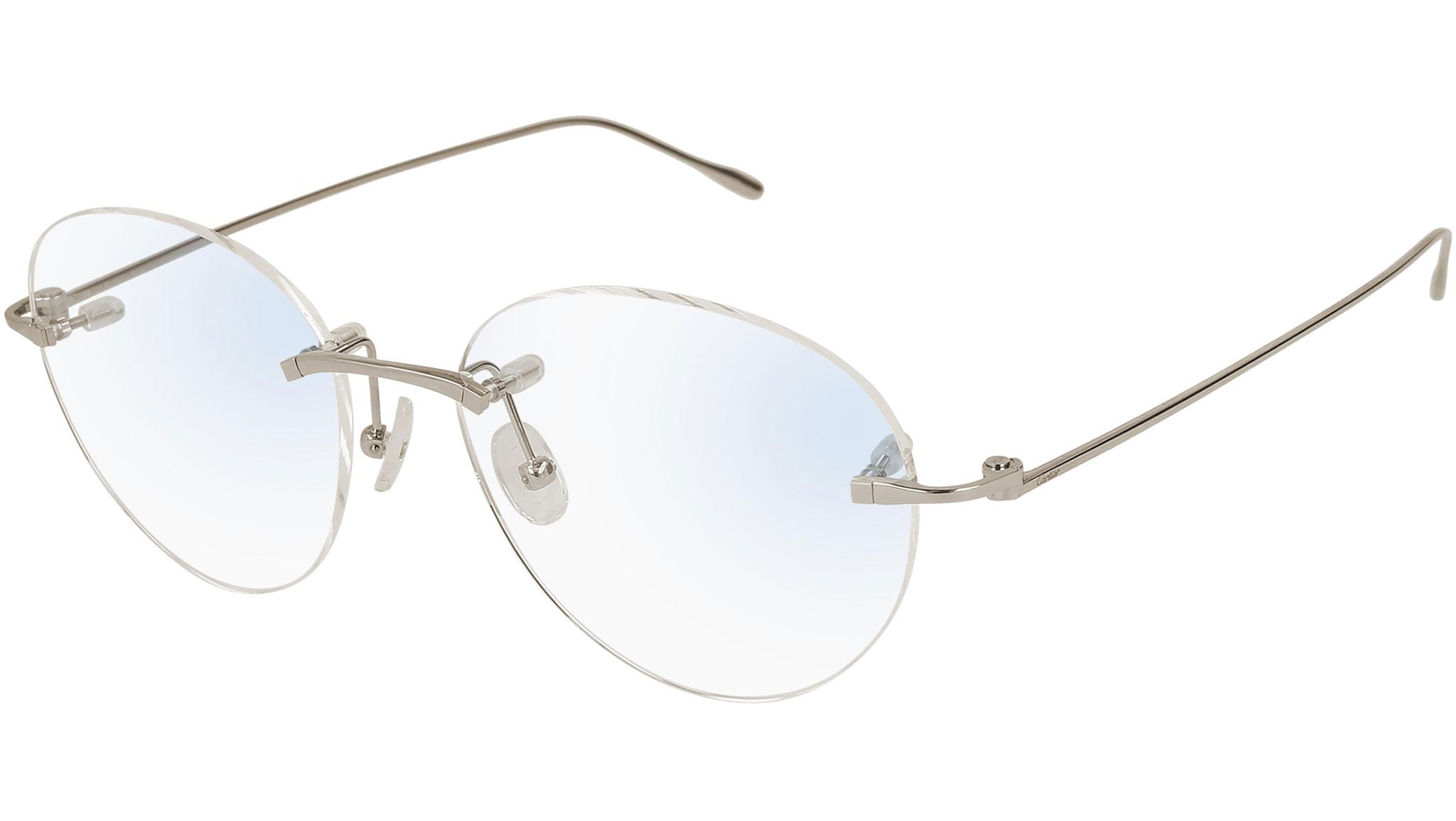 Cartier Precious optical collection model CT0094O 001 featuring shiny grey solid gold frame and silver temple.